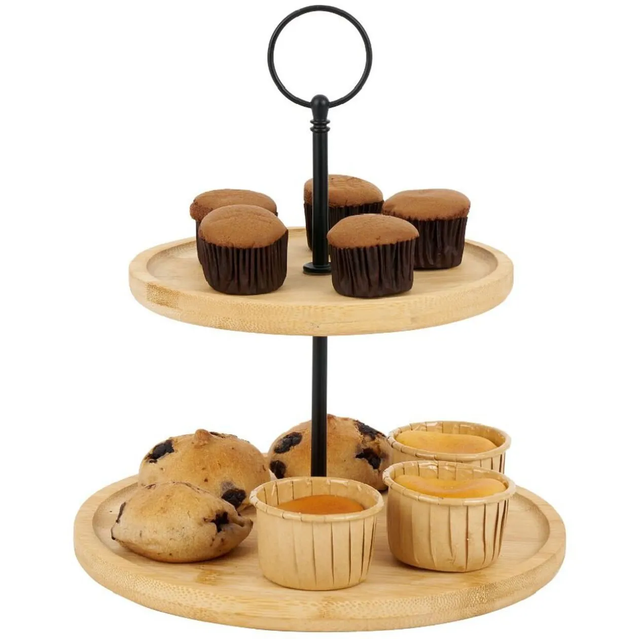 Fabriqué en bambou et fer noir, ce plateau offre un diamètre de 16,5cm et une hauteur de 21,5 cm, parfait pour mettre en valeur vos délicieuses pâtisseries.