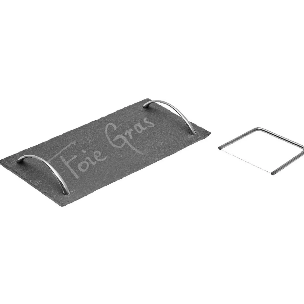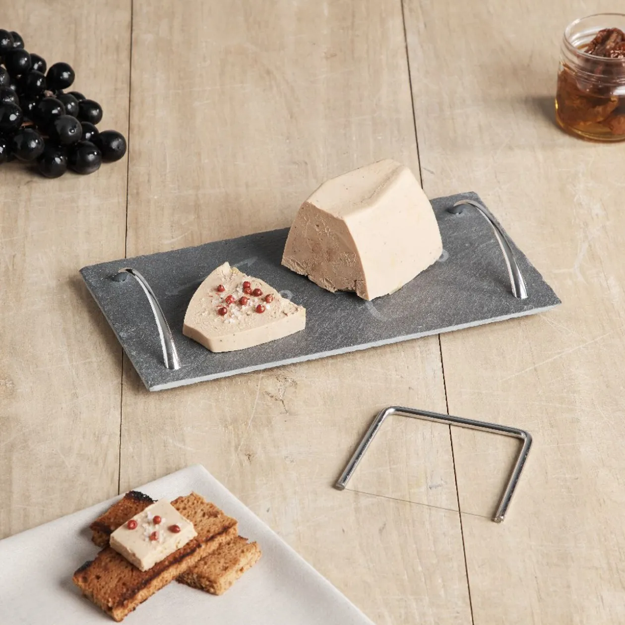 Pour les fêtes de fin d’année, ce plateau de service en ardoise sera idéal pour apporter votre foie gras à table grâce à ses deux anses. Avec la lyre, vous découperez facilement un foie gras cuit ou mi-cuit. Présentez également d’autres mets avec ce plateau comme un chèvre au miel ou des tourbillons de courgettes et dégustez un bon repas.