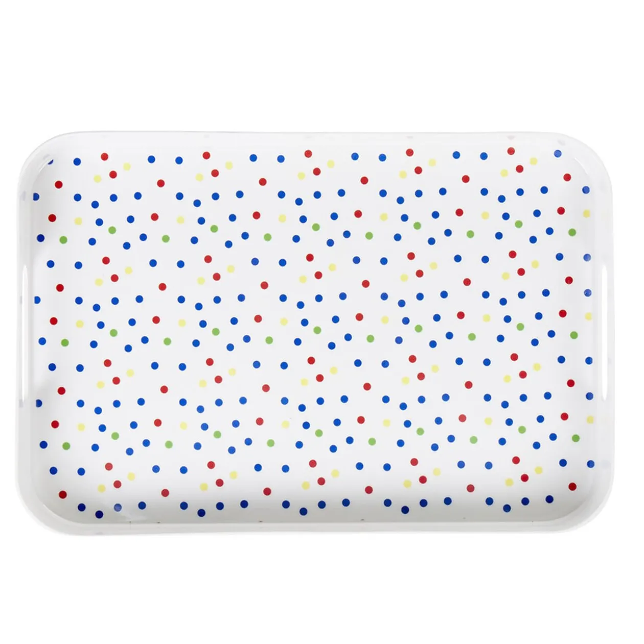 Plateau en plastique mélaminé blanc et intérieur à motif pois multicolores.