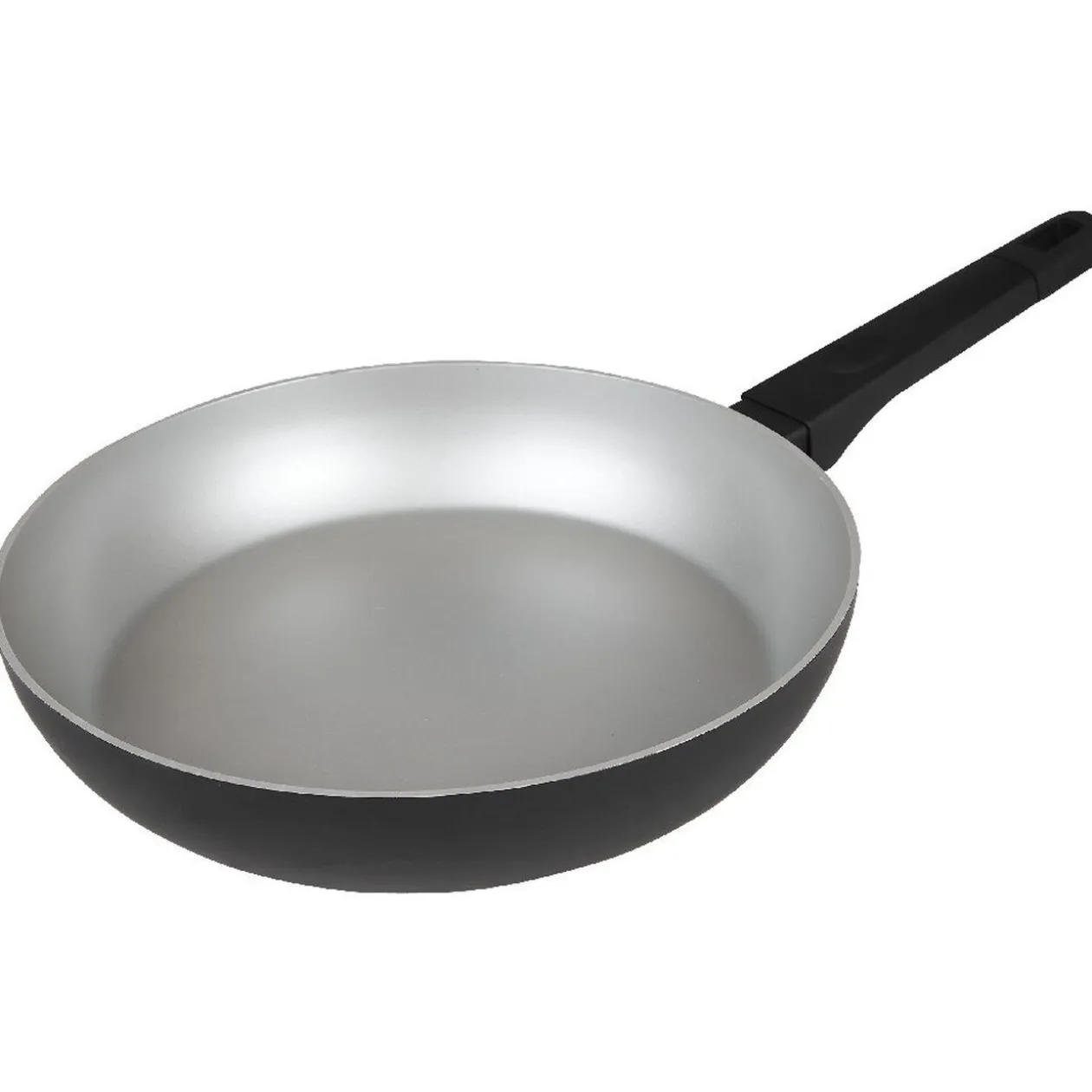 Poêle en aluminium avec revêtement anti-adhérent et manche en plastique.