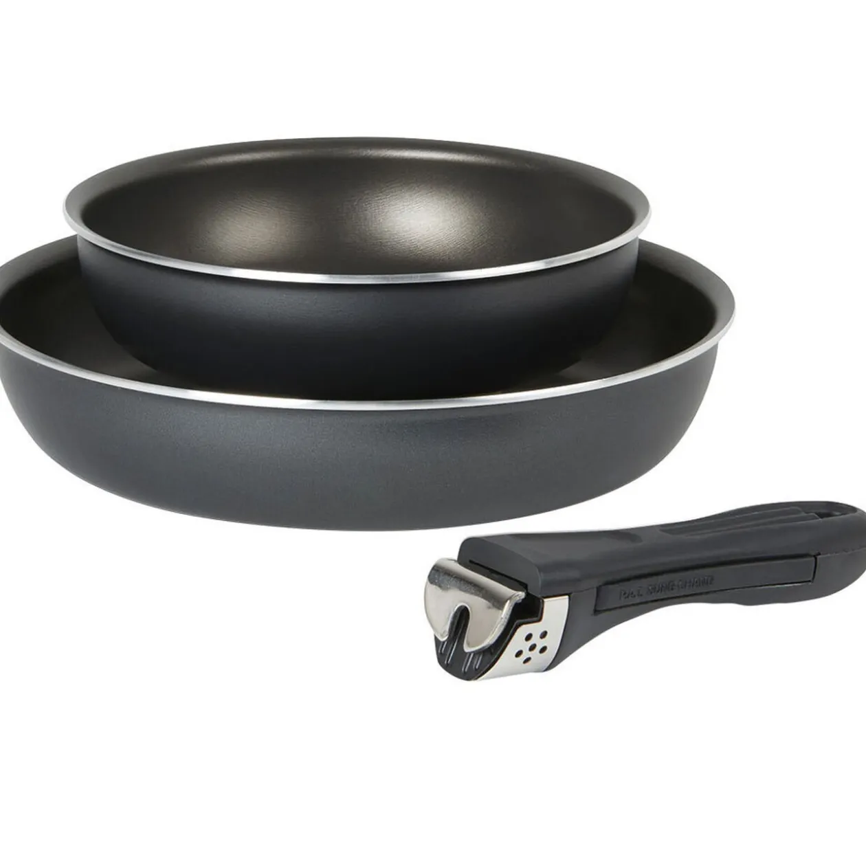Lot de 2 poêles antiadhérentes en aluminium gris 2,7 mm, ø 20 et 26 cm, avec 1 poignée amovible.