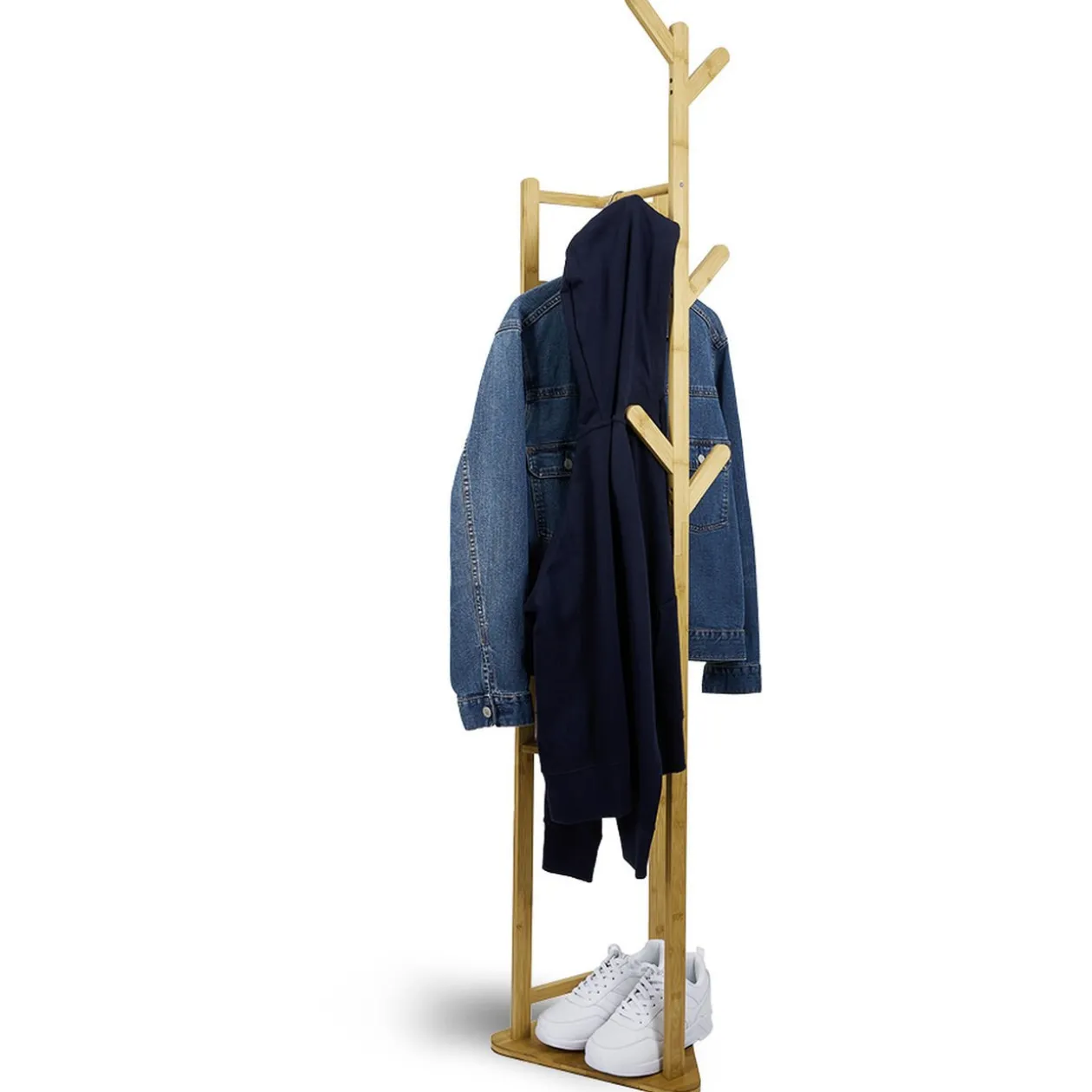 Idéal pour les petits espaces, ce portant en bambou vous offre de nombreuses possibilités de rangement grâce à ses 2 étagères où vous pourrez disposer vos chaussures, son espace porte-manteaux composé de 6 crochets et son coin penderie pour entreposer quelques vêtements sur cintres.
