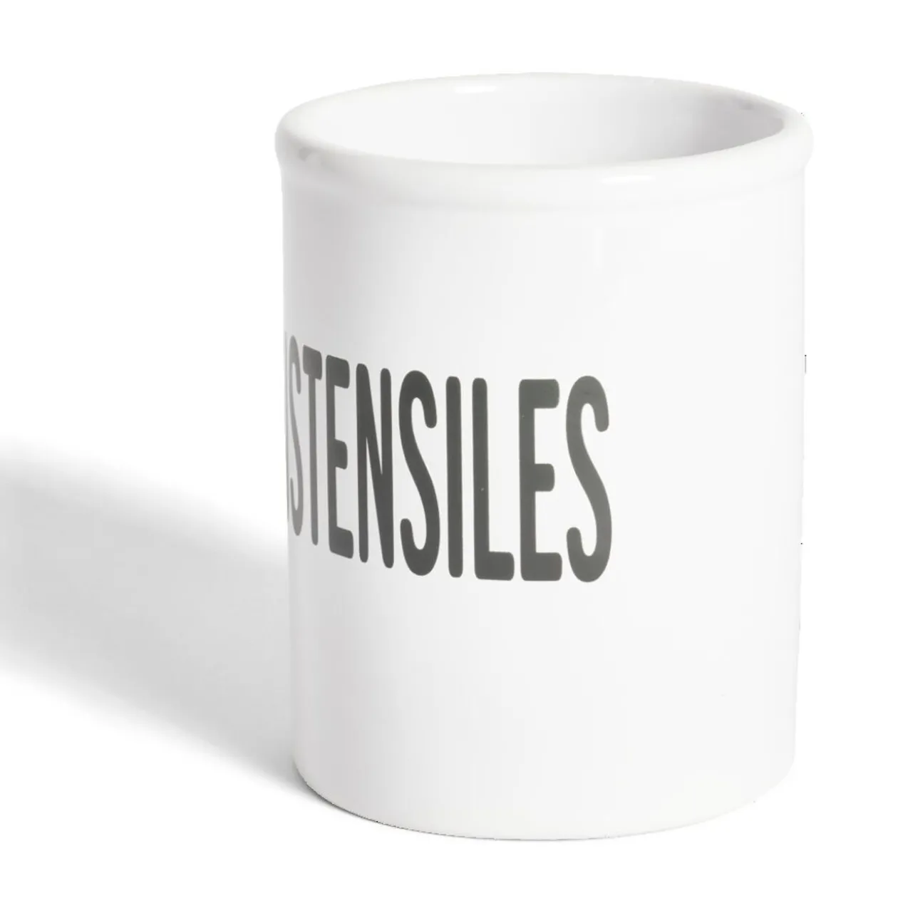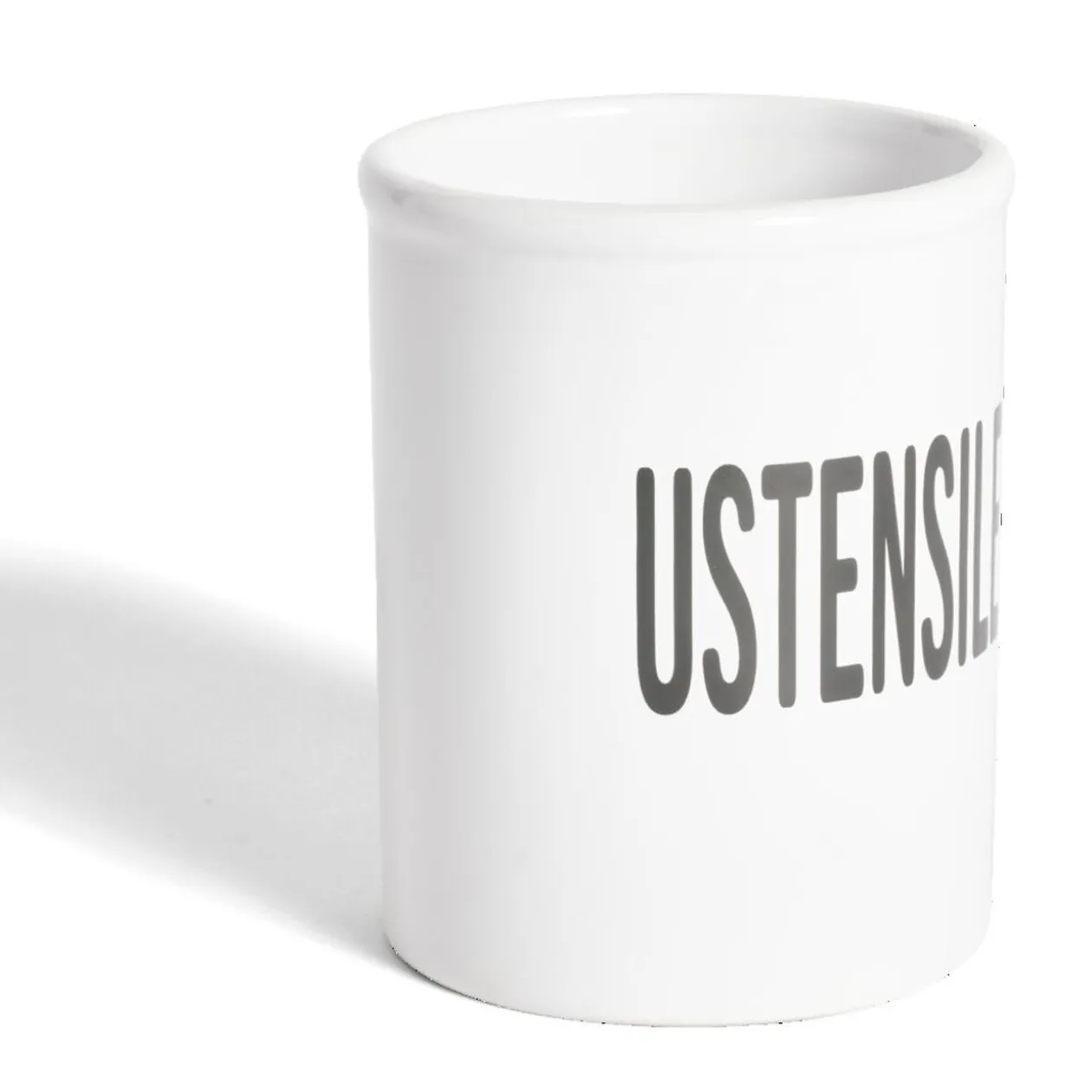 Pot à ustensiles en dolomite blanc, d’un diamètre de 10cm et d’une hauteur de 13,2cm.