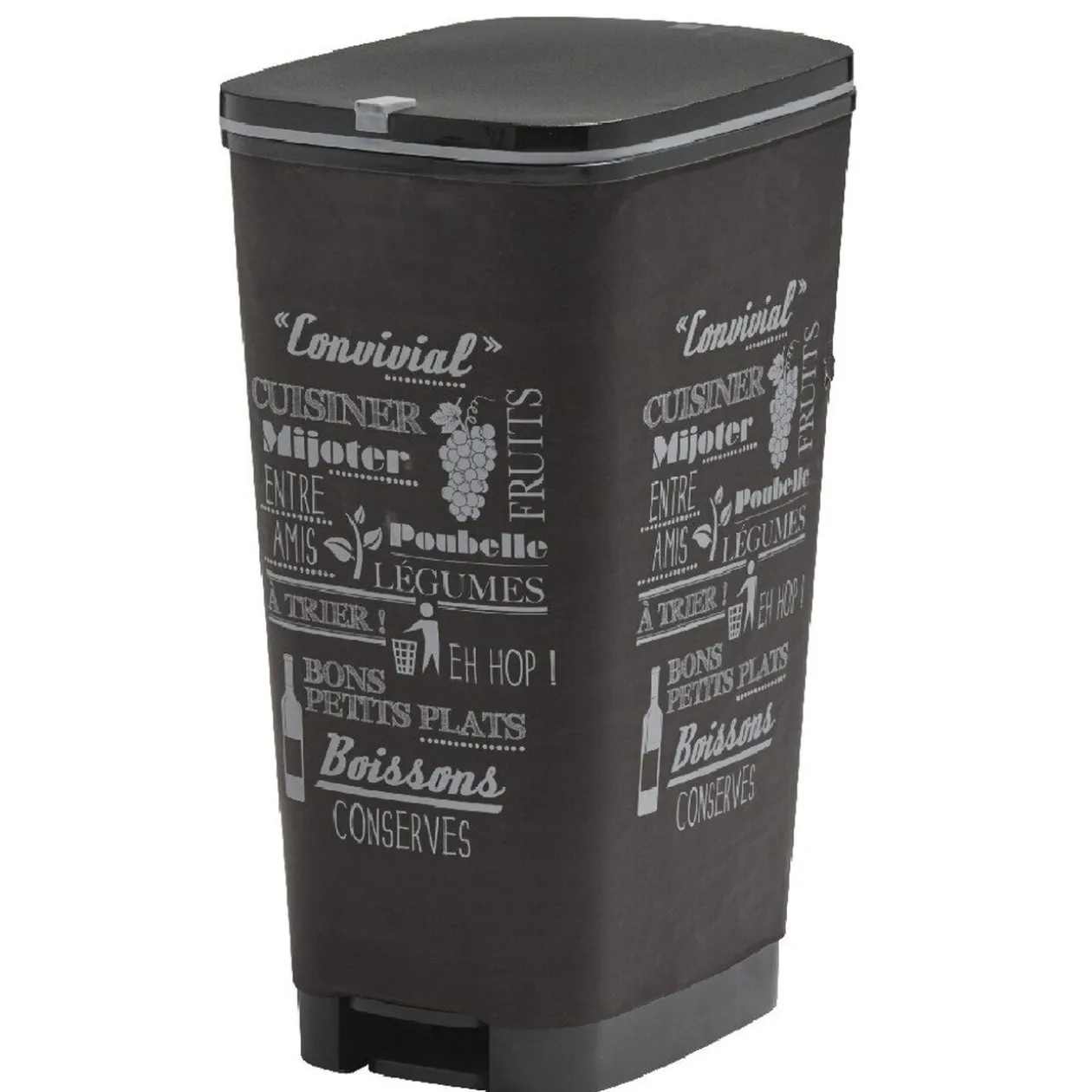 Poubelle à pédale grise avec inscriptions, cont. 45 L, dim. 29×44,5xh.60,5 cm, polypropylène.