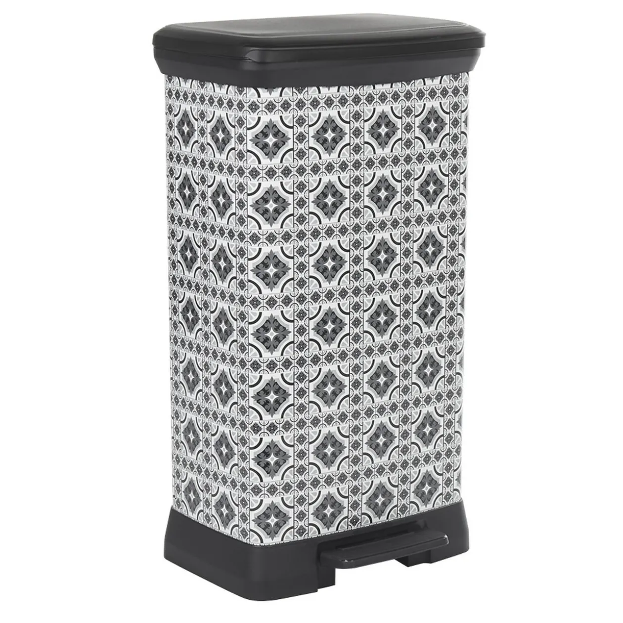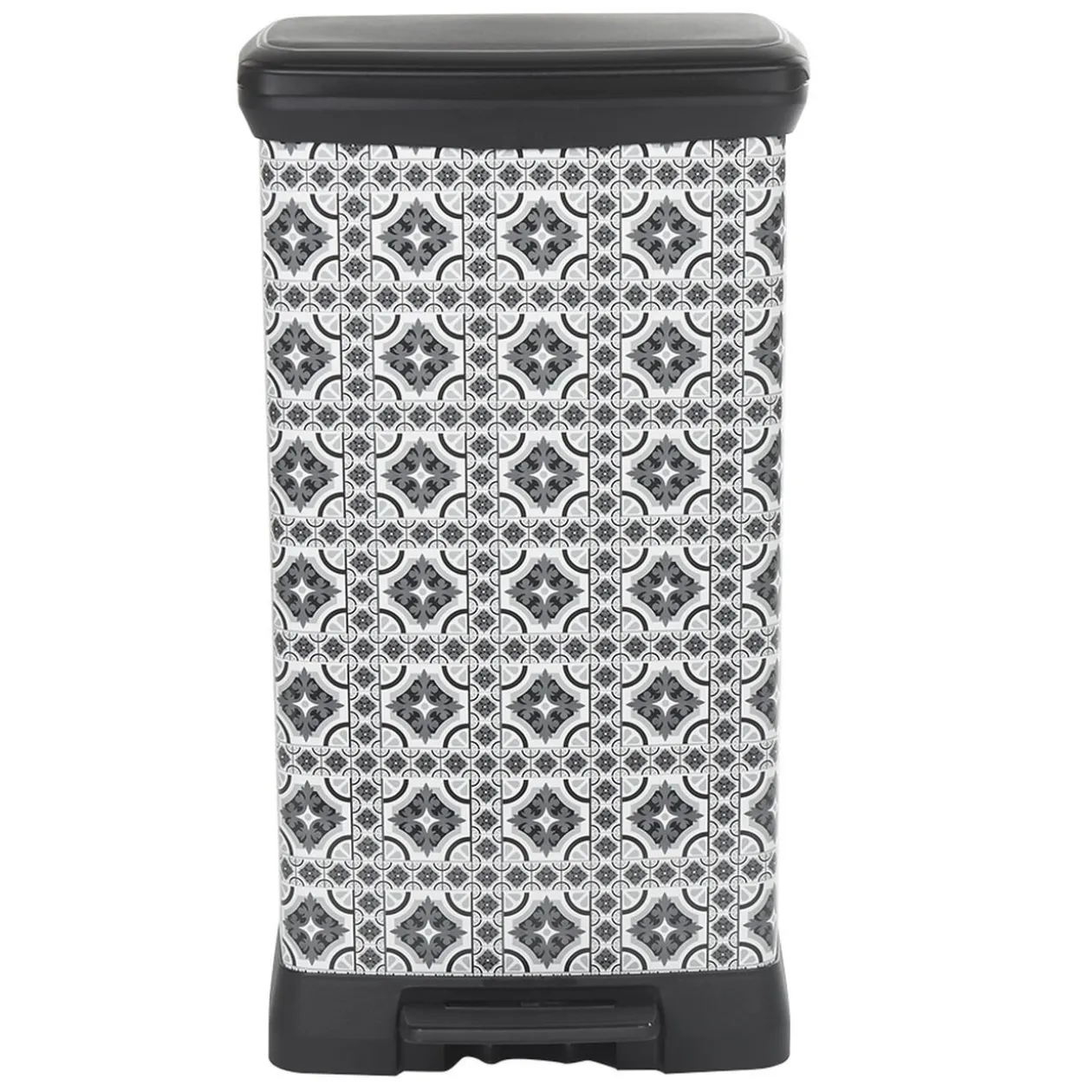 Poubelle à pédale avec motifs carreaux de ciment de couleur grise et blanche. Sa contenance de 50 litres vous permettra de stocker plus de déchets qu’habituellement !