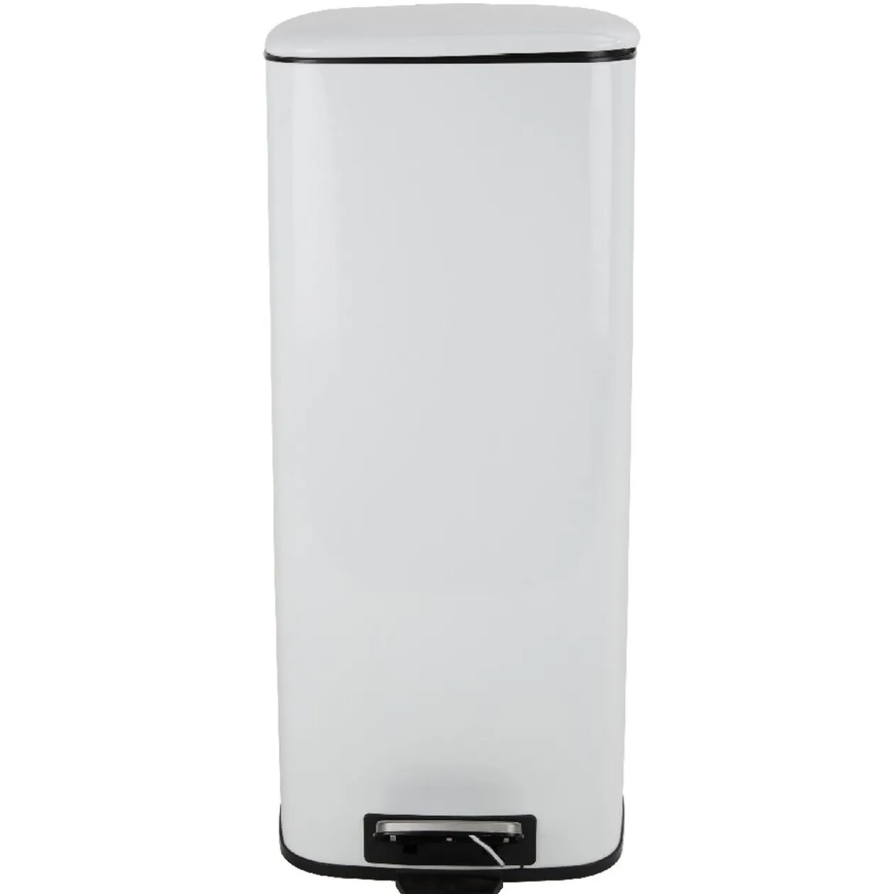 Poubelle à pédale avec frein de chute en métal blanc. De forme rectangulaire, son design compact et moderne se glissera facilement dans la cuisine.