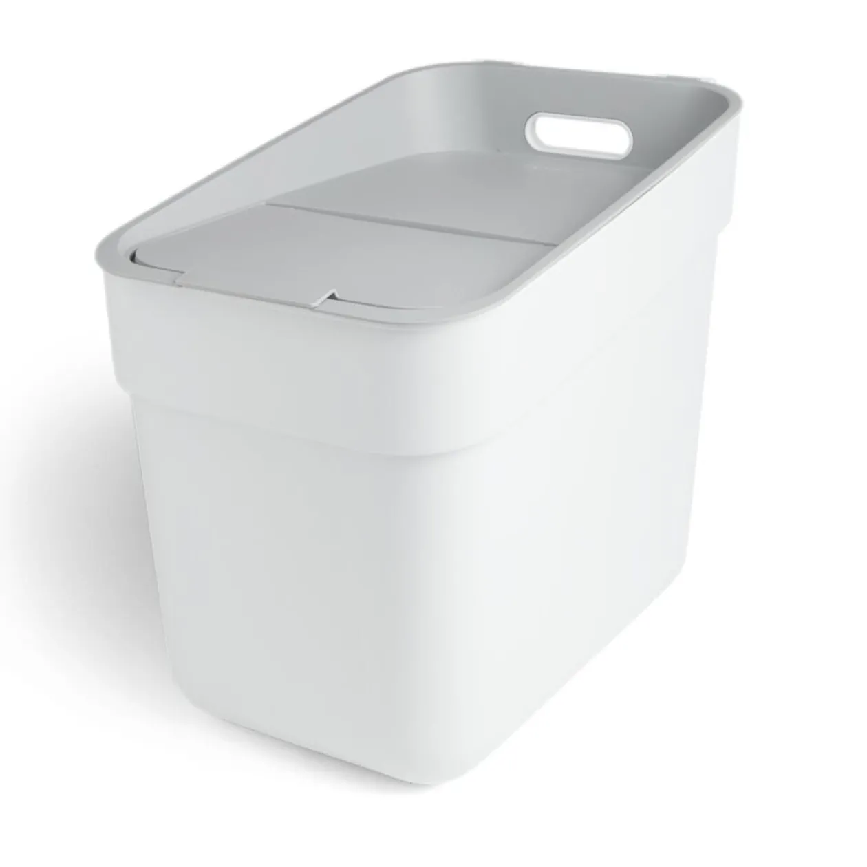 Optimisez votre tri sélectif grâce à cette poubelle blanche munie d’un couvercle gris clair, un choix pratique et esthétique.