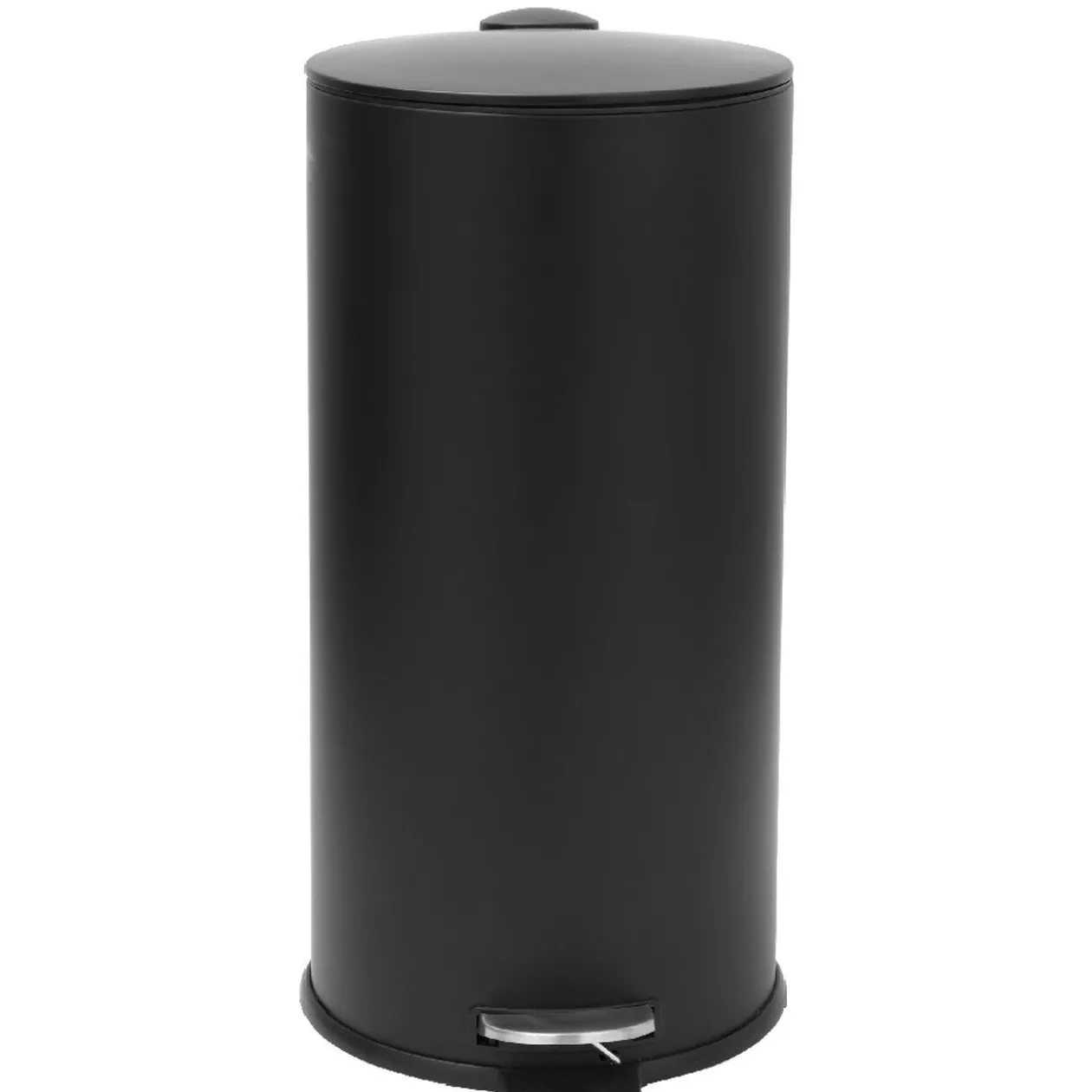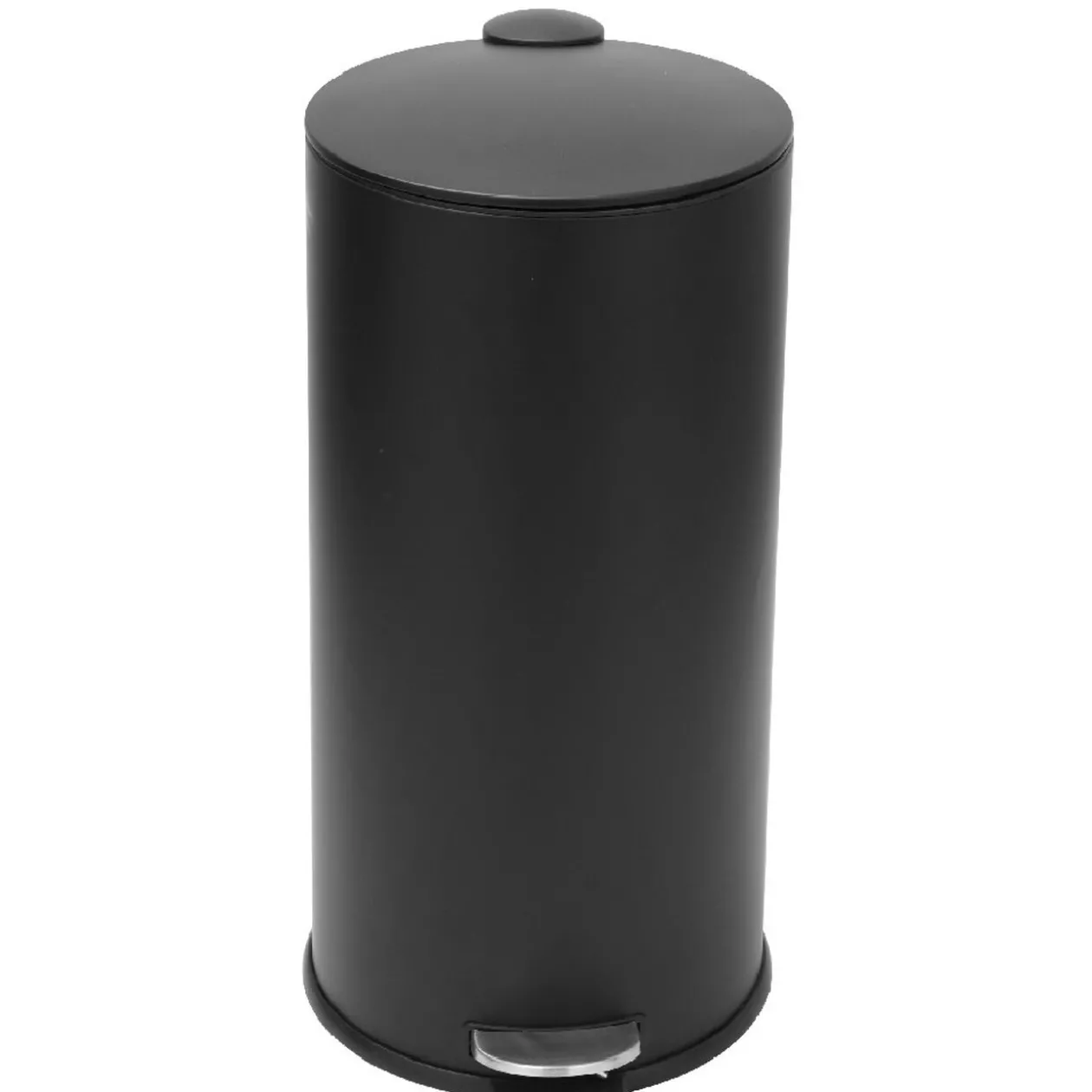 Poubelle ronde à pédale en métal et plastique noir. Design épuré facile à intégrer dans tous les styles de décorations.