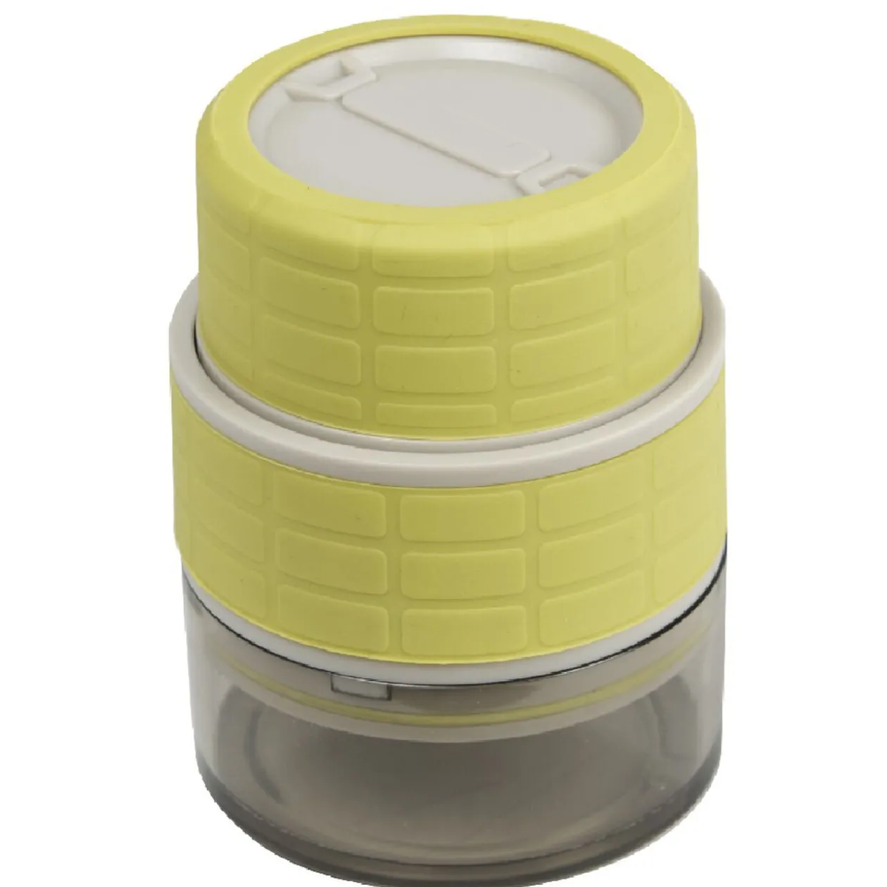 Presse ail en plastique inox avec compartiment. Coloris: gris et vert.