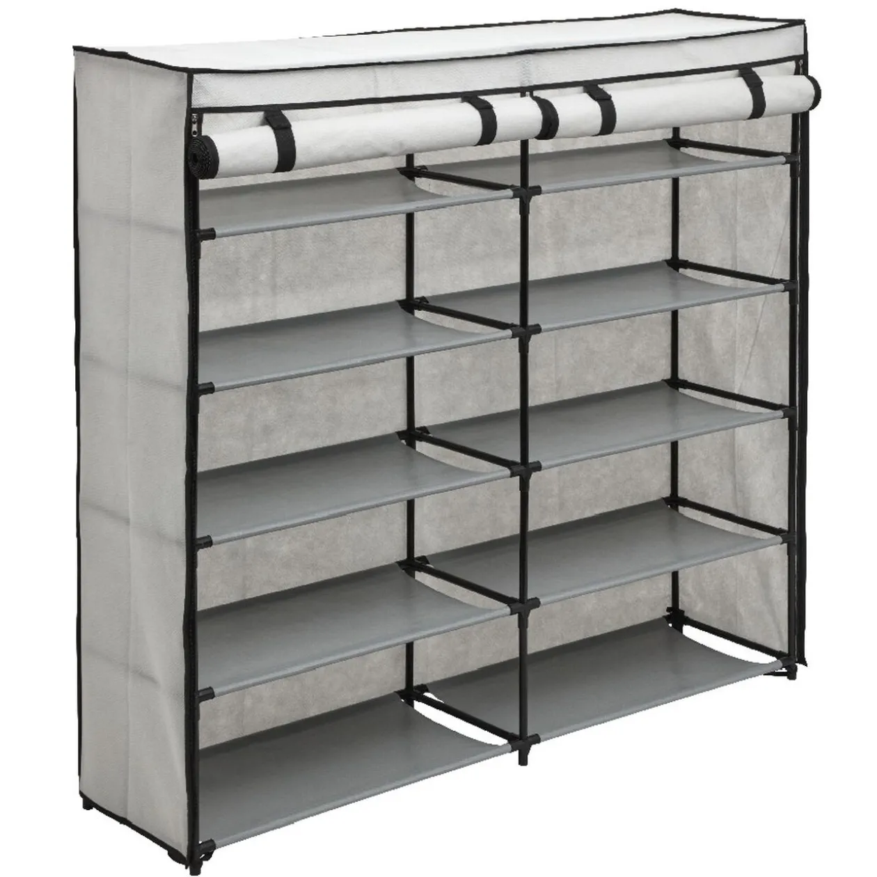 Idéal dans un garage, ce range chaussures en tissu gris clair s’ouvre et se ferme en seul geste grâce à sa fermeture à glissière. Il vous permettra de ranger jusqu’à 30 paires de chaussures et de tenir la toile ouverte grâce à ses fixations.