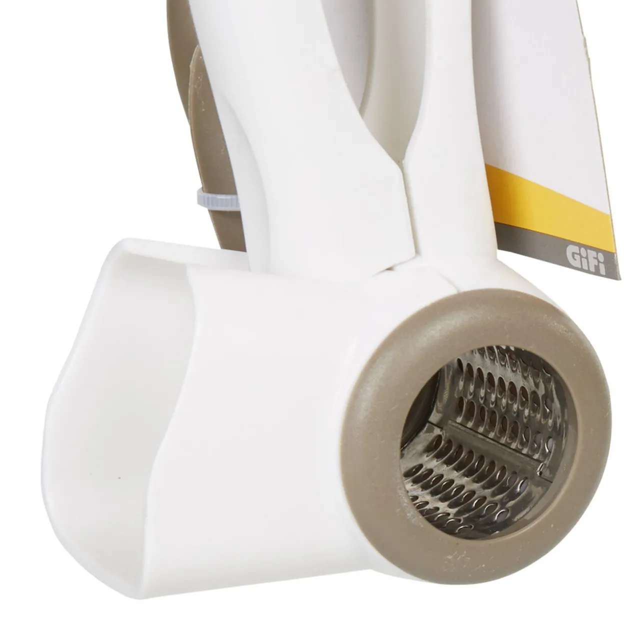 Râpe à fromage blanche et grise, en plastique et inox.