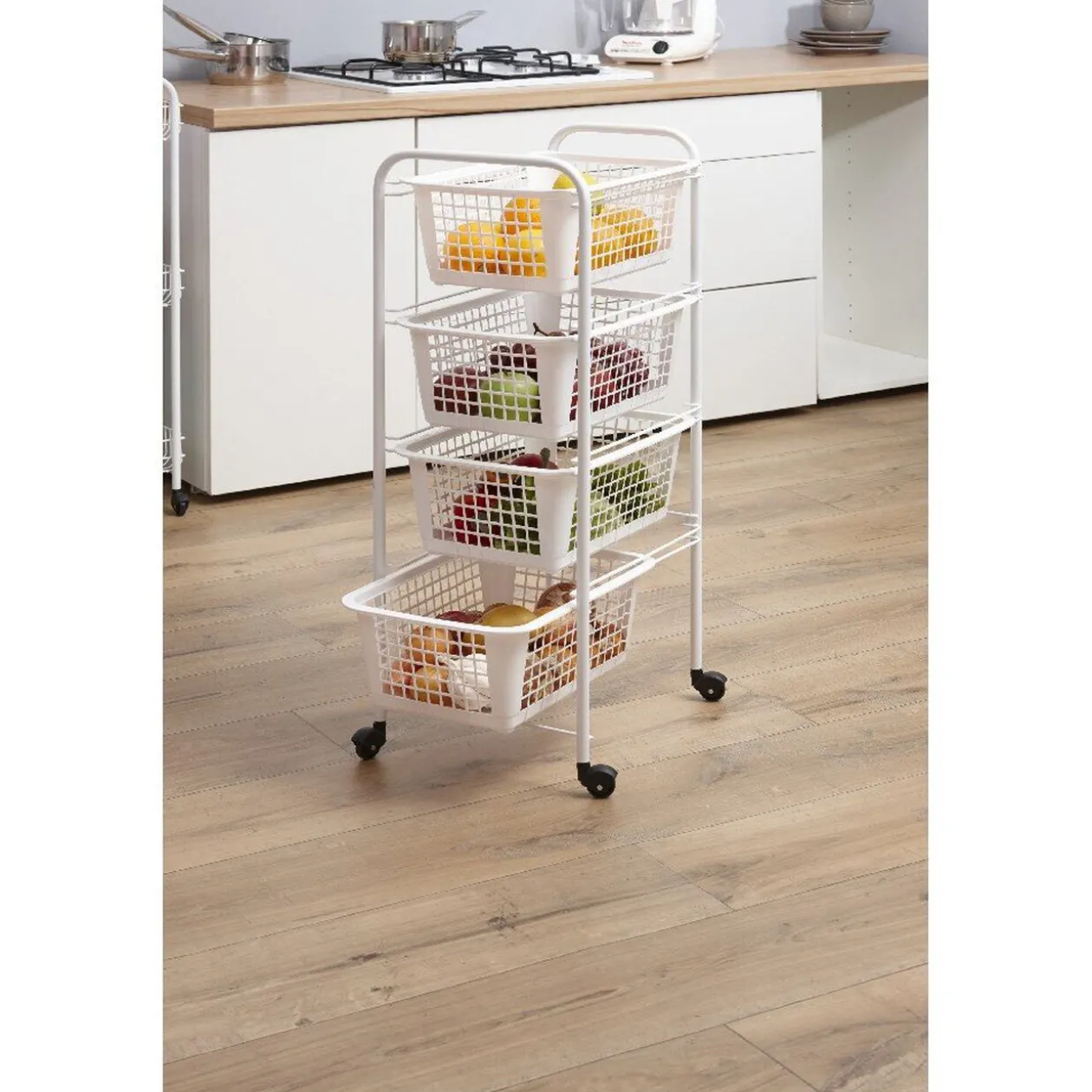 Resserre à légumes blanc à roulettes, 4 corbeilles coulissantes, dim. 30x38x83 cm, métal et plastique.