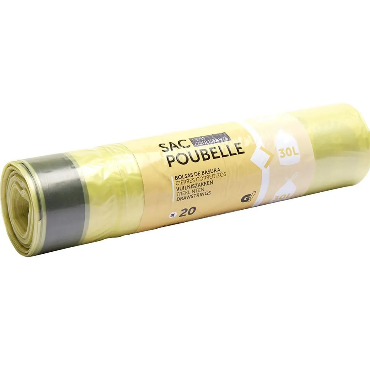 Lot de 20 sacs poubelle de 30L, coloris jaune transparent.