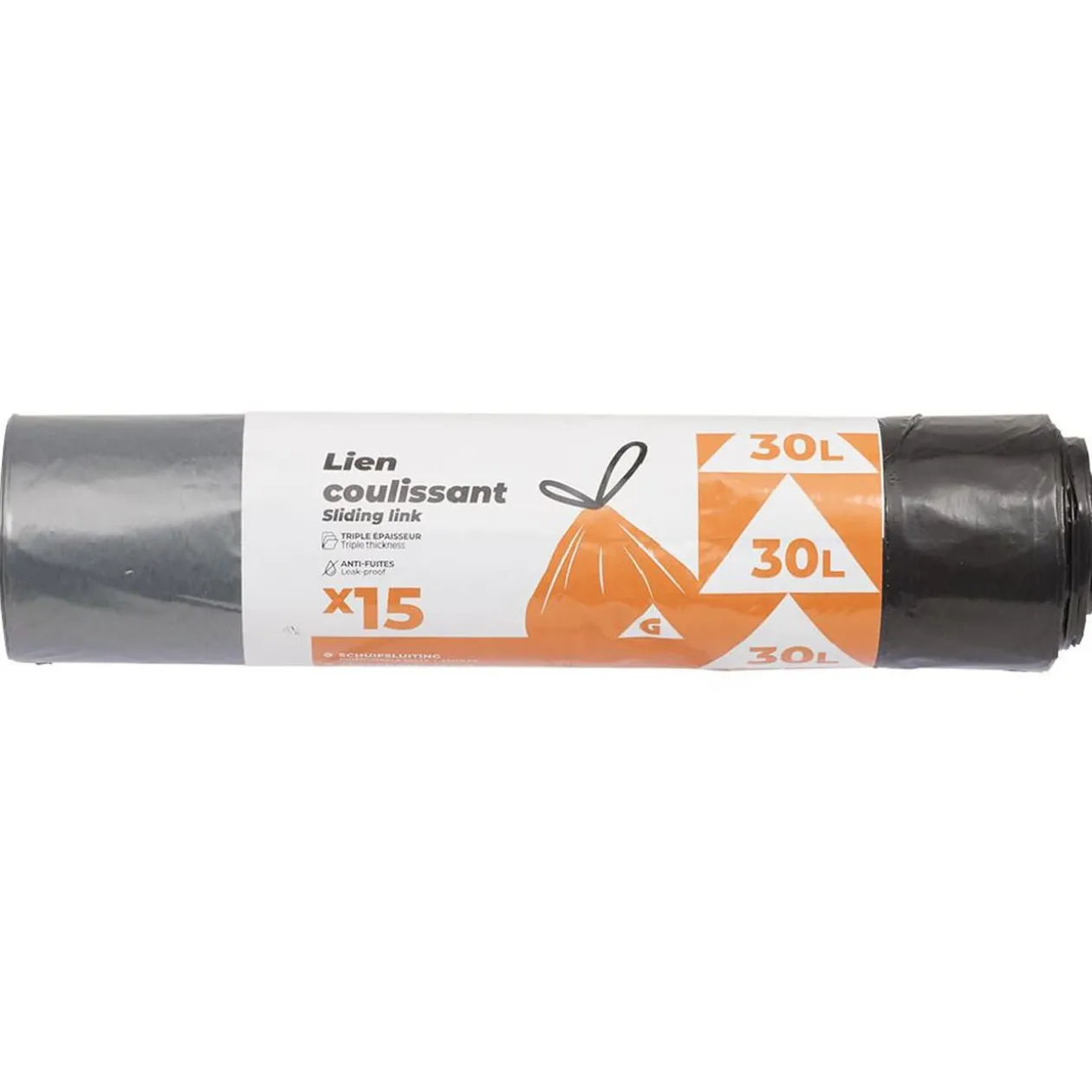 Lot de 15 sacs poubelle d’une contenance de 30 litres avec lien coulissant.