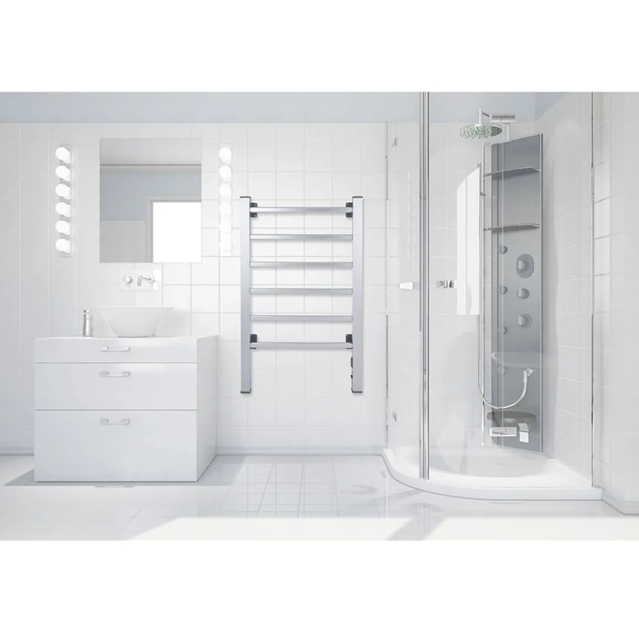 Sèche-serviette électrique composé de 6 barres chauffantes, à poser au sol ou à fixer au mur (kit de fixation murale et pieds inclus).