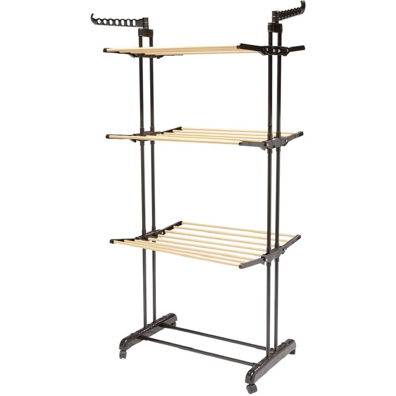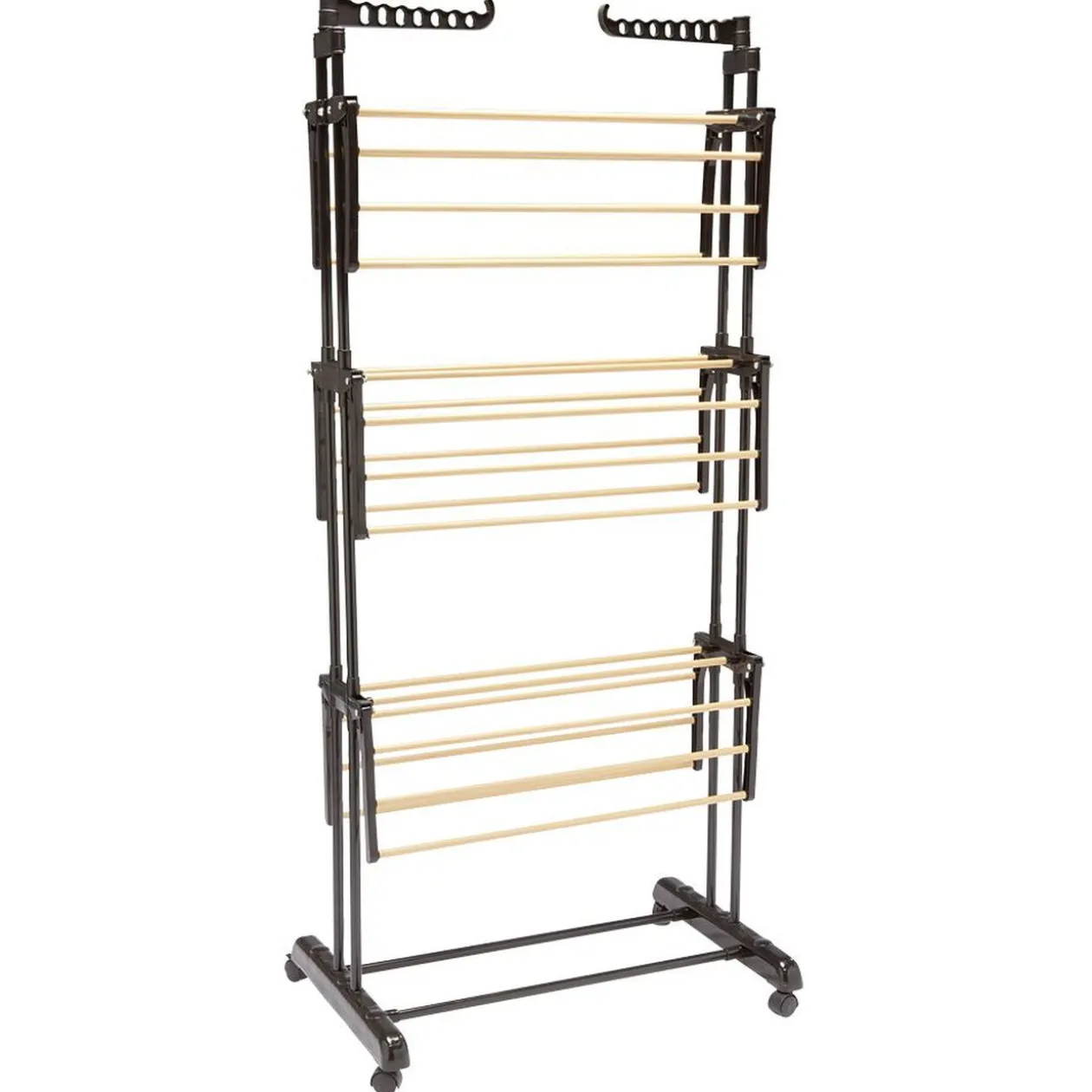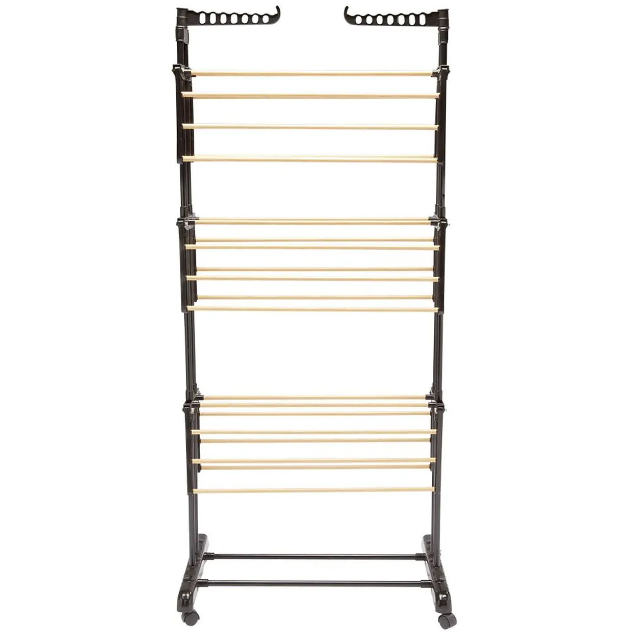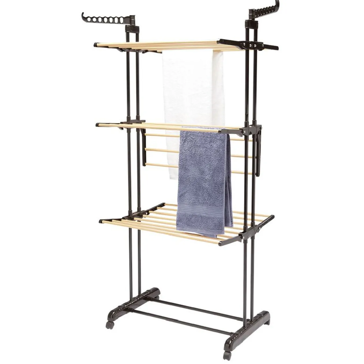 Séchoir de 16 mètres d’étendage sur 3 niveaux avec structure bicolore en métal et plastique noir et naturel.
