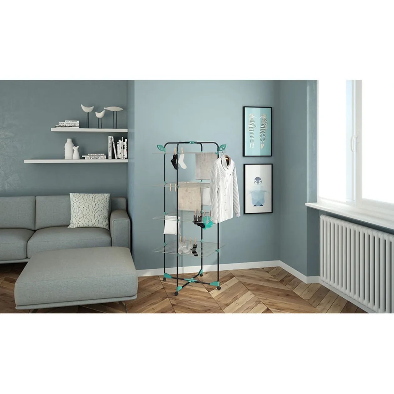 Pratique, son système de demi-ouverture permmet de positionner le séchoir contre un mur. Porte cintres rabattables inclus.