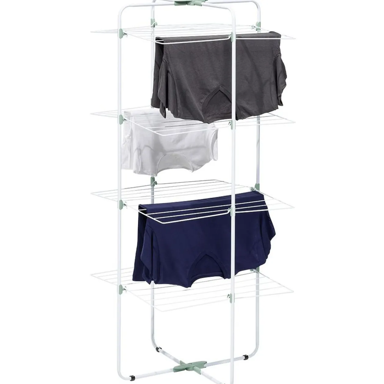 Séchoir tour à 4 niveaux avec structure résistante en acier et roulettes facilitant le déplacement.