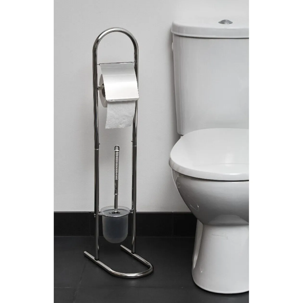 Serviteur en inox dérouleur pour papier WC avec brosse incluse.