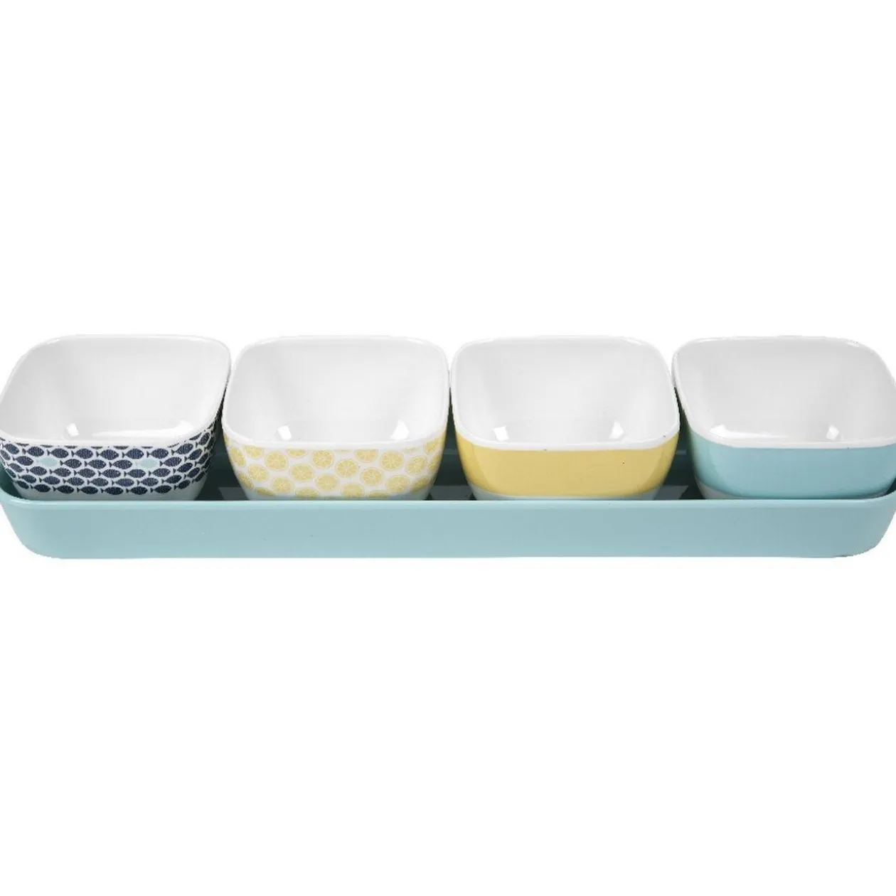 Set de 4 coupelles en mélaminé déco jaune et bleu et leur support uni bleu, idéal pour le service des petits apéritifs, sauces et dips.