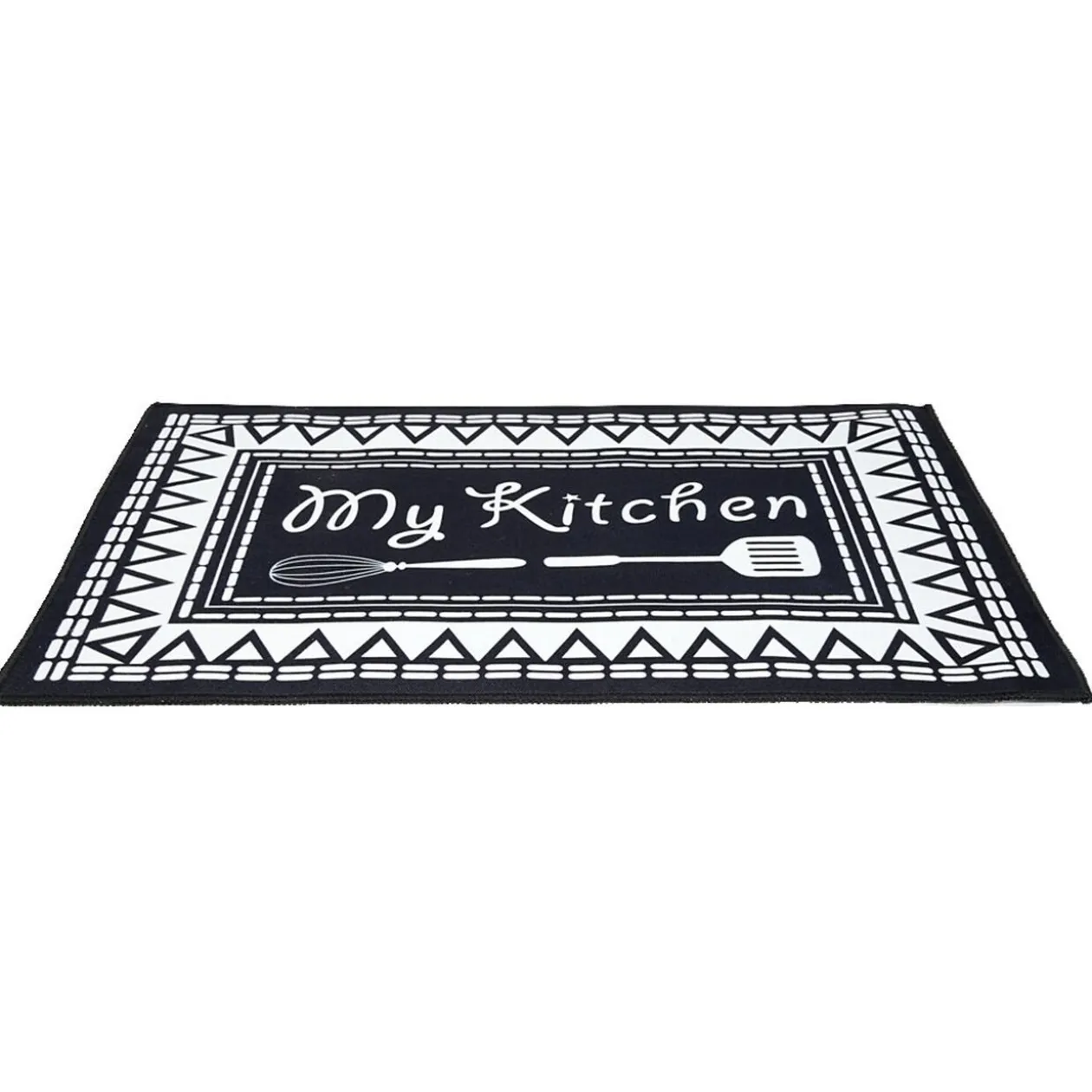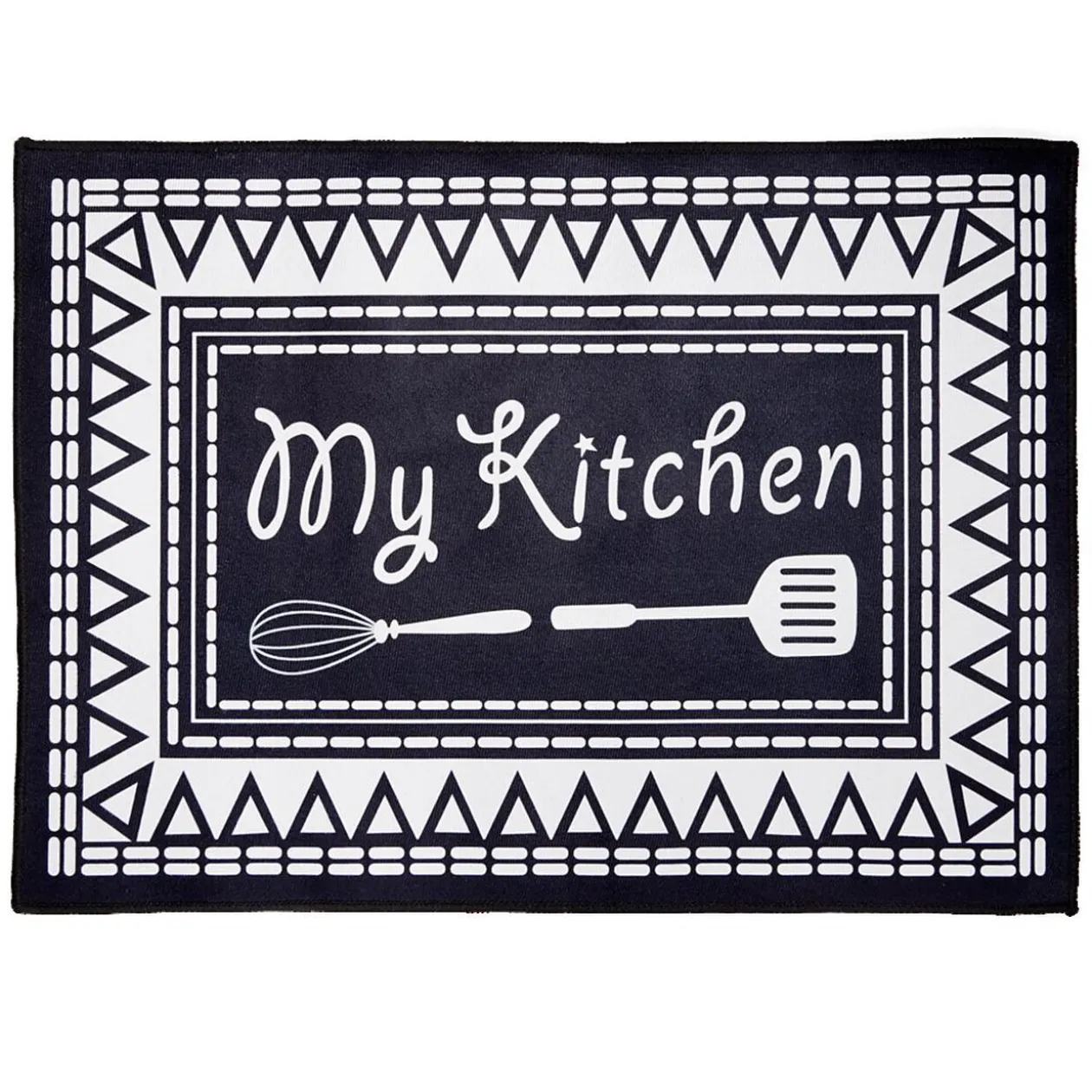 Ajoutez une touche déco à votre cuisine en disposant ce tapis rectangulaire noir et blanc « My Kitchen » décoré de motifs ethniques.