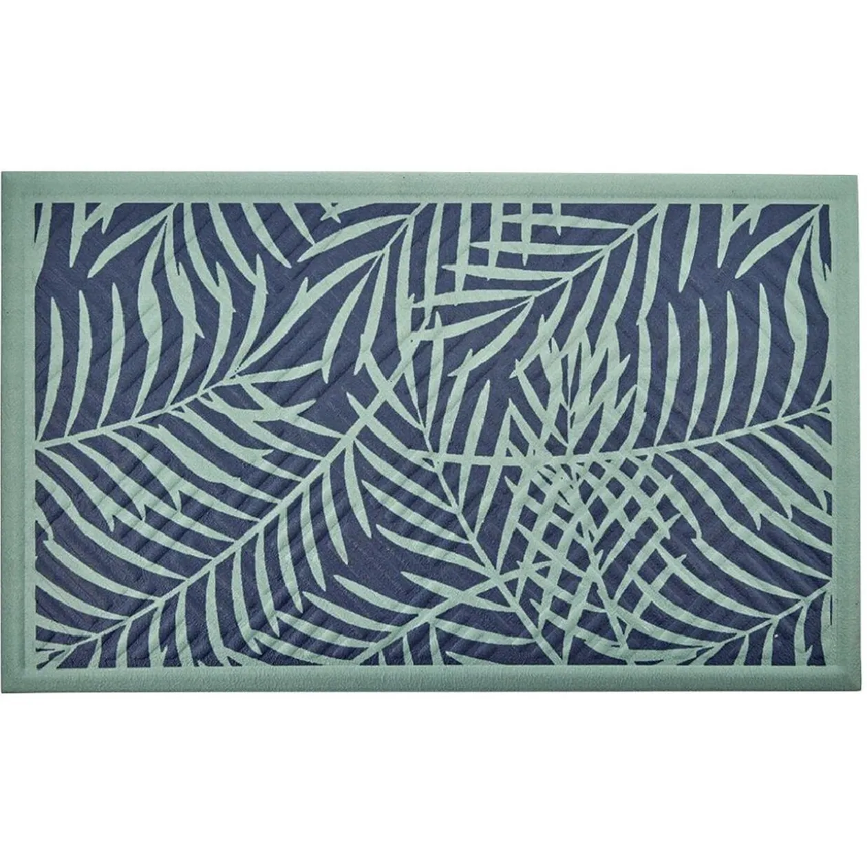 Tapis d’extérieur imprimé feuillage bleu et vert, idéal pour apporter une touche exotique à votre entrée.