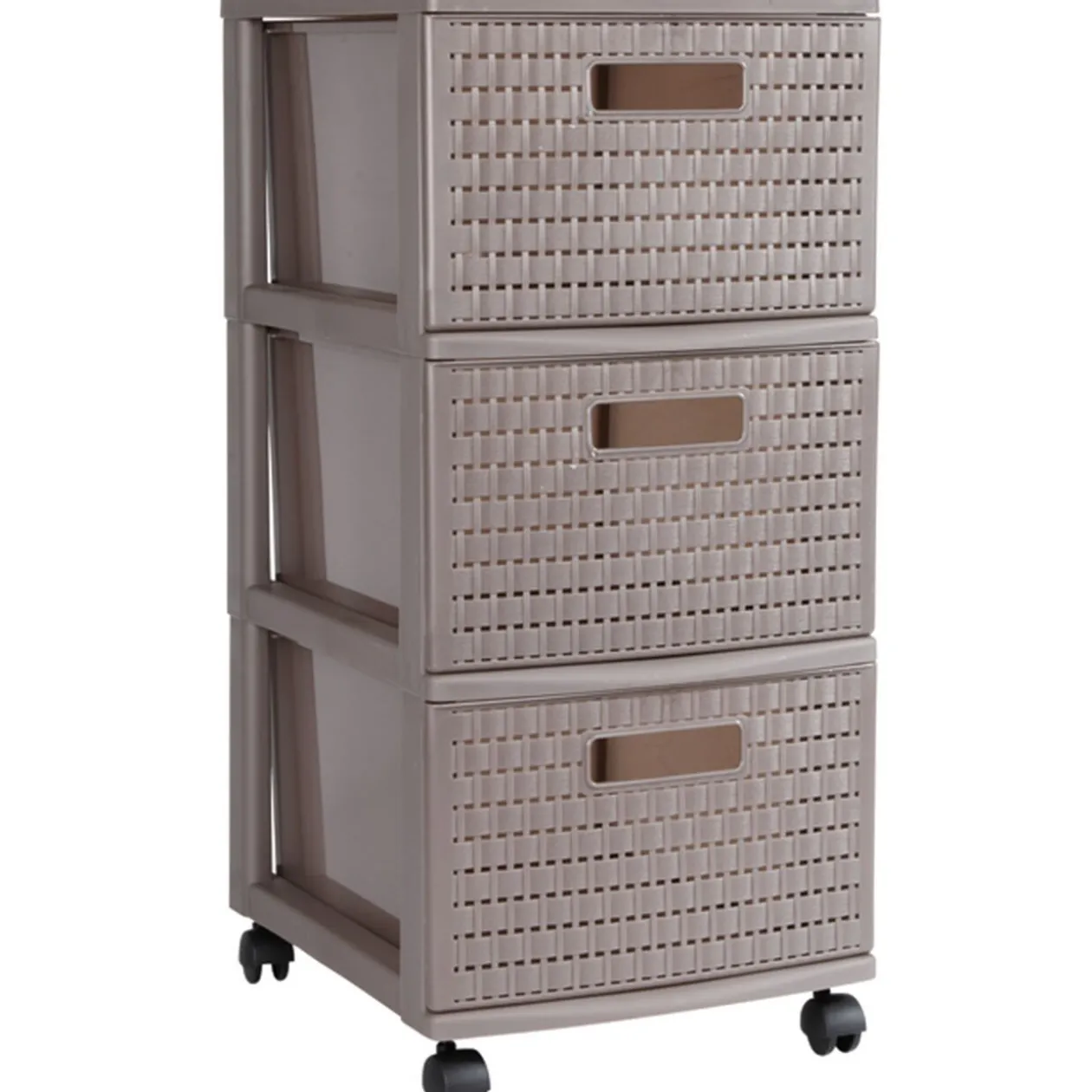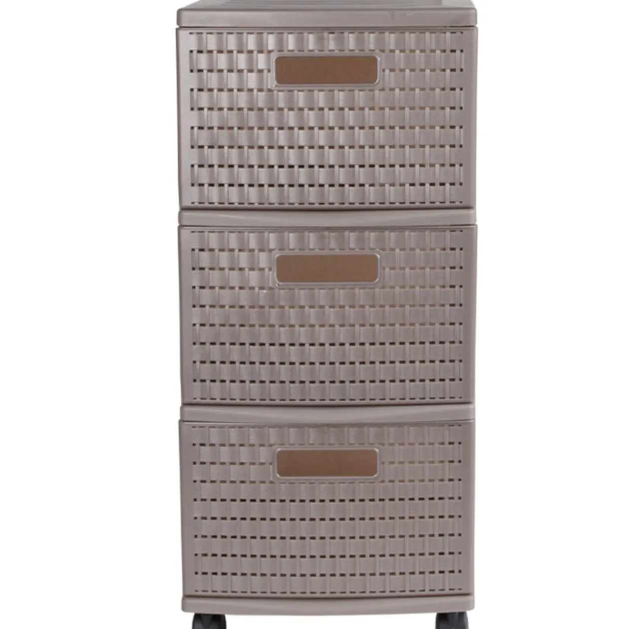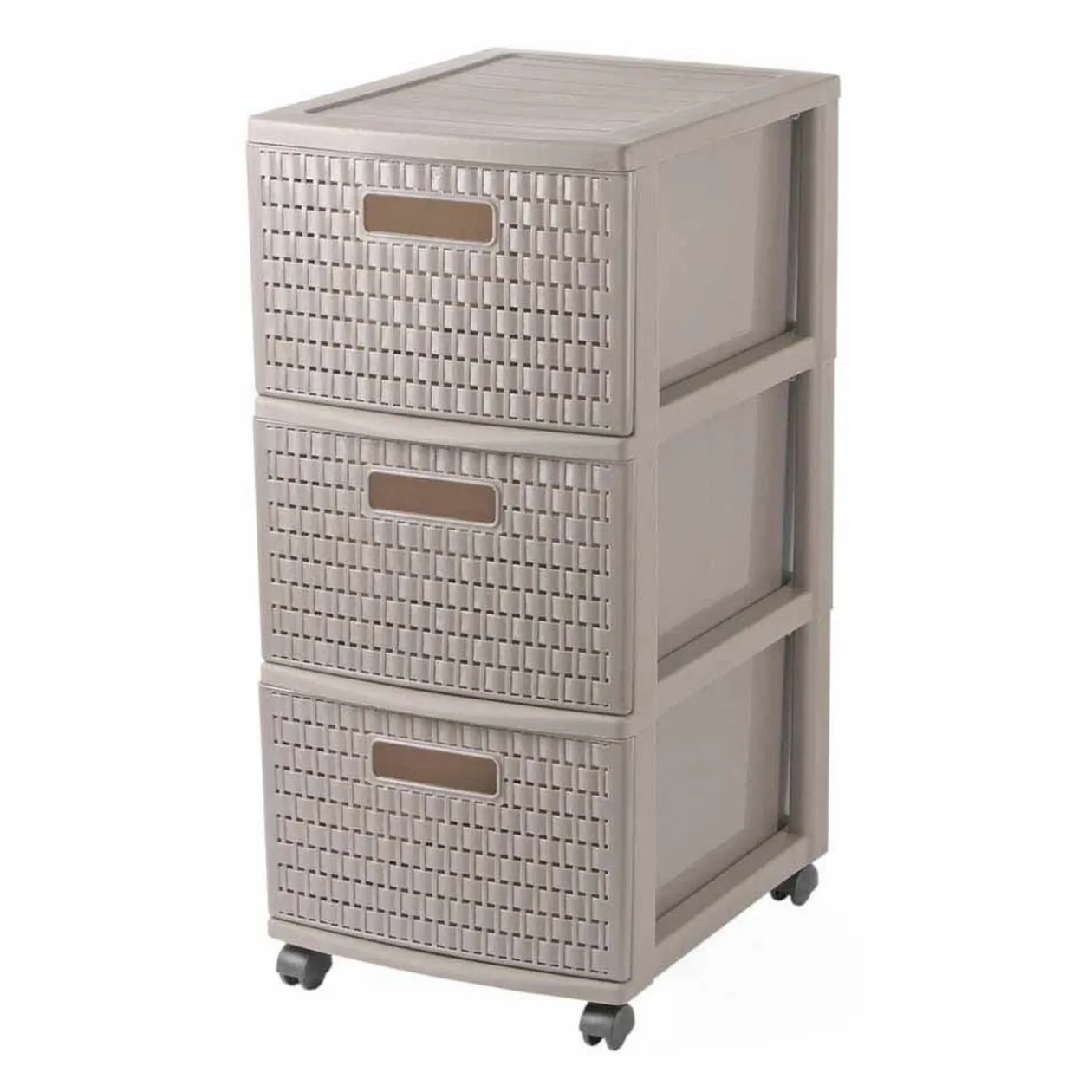 Tour de rangement sur roulettes rotationnables à 360°C avec 3 tiroirs chacun équipé d’une poignée.