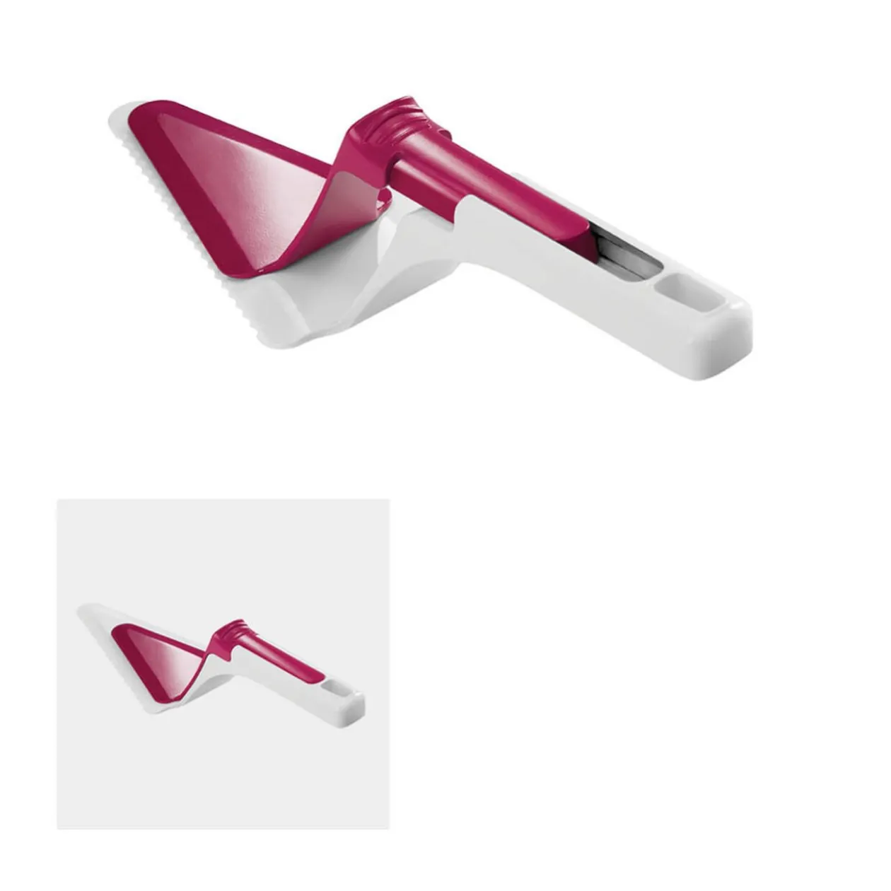 Tranche pelle à tarte Metaltex avec poussoir, de couleur blanche et rouge pourpre. Ne vous embêtez plus pour couper et servir vos gâteaux. Avec ce tranche pelle, adieu les dégâts et bonjour les belles assiettes !
