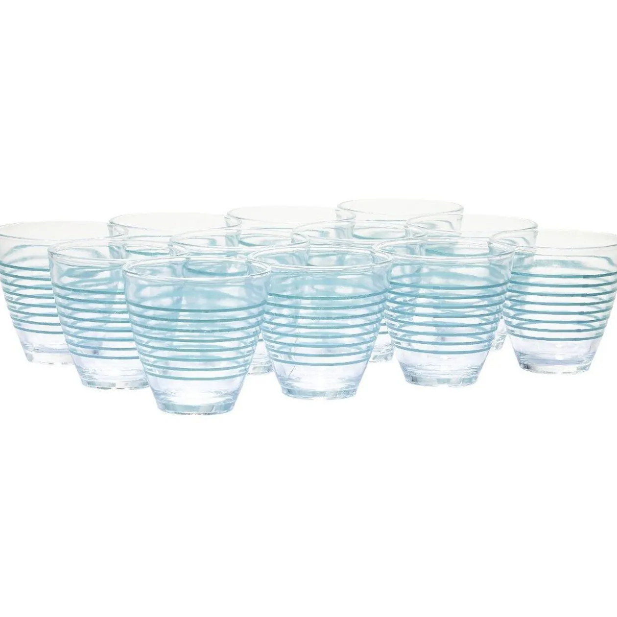 Lot de 12 verres bas transparents décorés de rayures bleues.