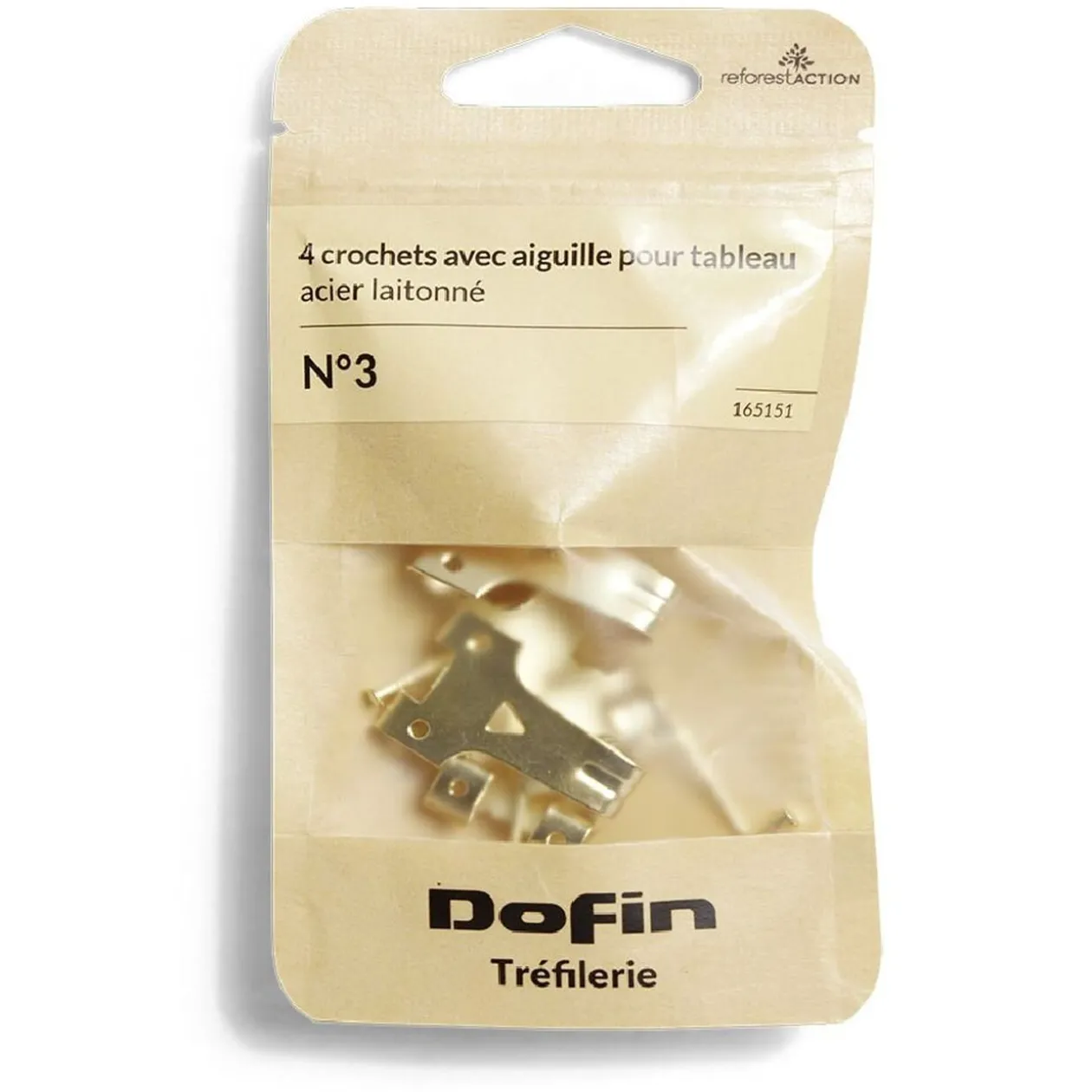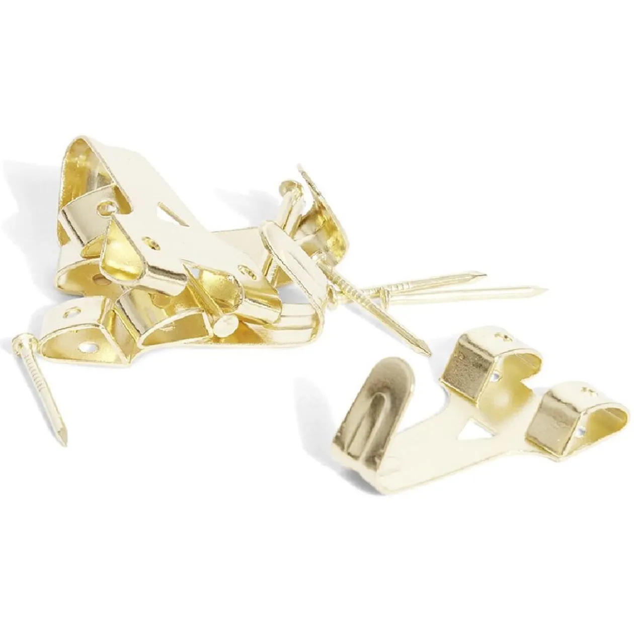 Lot de 4 crochets en acier laitonné avec aiguilles N°3 pour fixer des tableaux et cadres légers au mur.