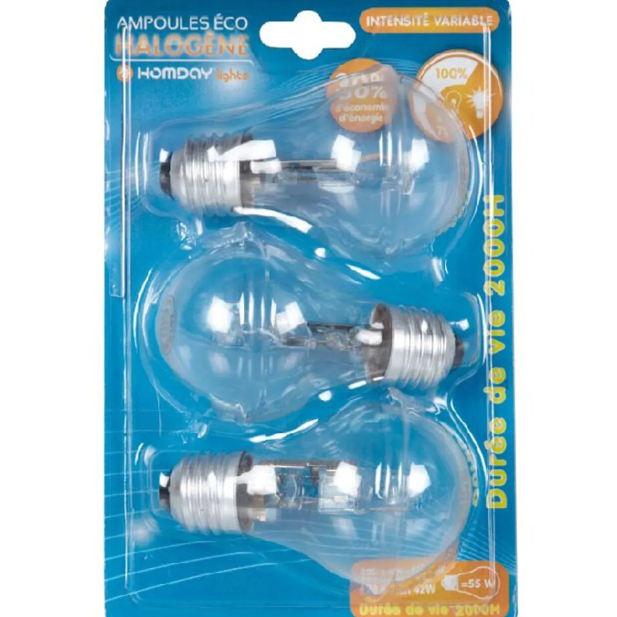 3 ampoules halogène économie d’énergie, intensité variable, culot E 27, puissance 55 W.