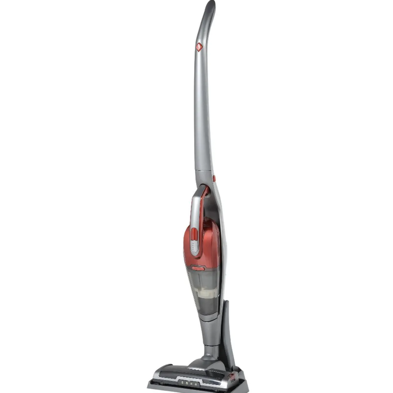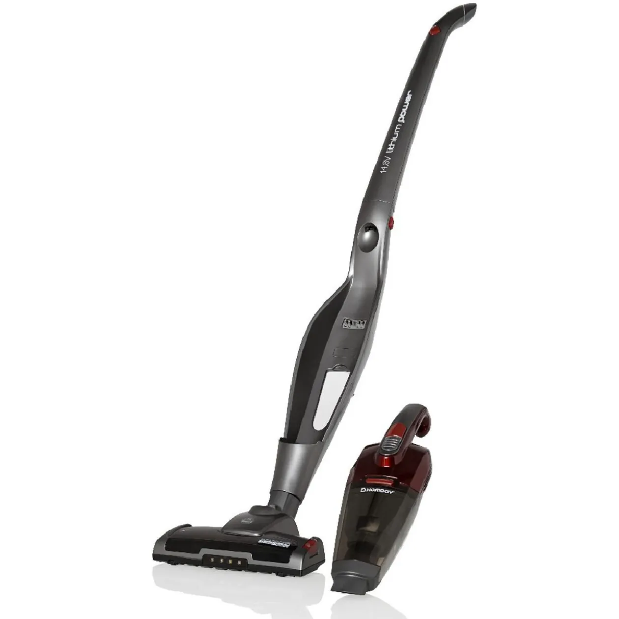 Aspirateur balai 2 en 1 rouge et gris Homday. Se transforme en apirateur à main.