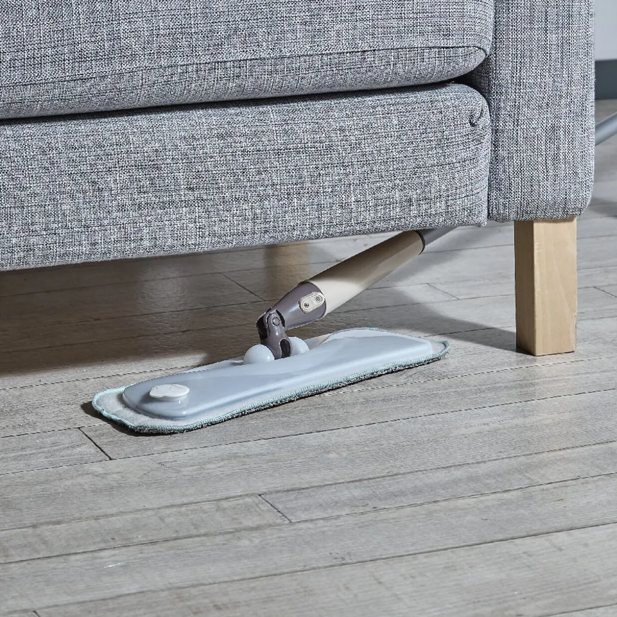 Balai Flash Spray avec réservoir intégré d’une contenance de 40 cl et recharge microfibre réutilisable et lavable en machine.