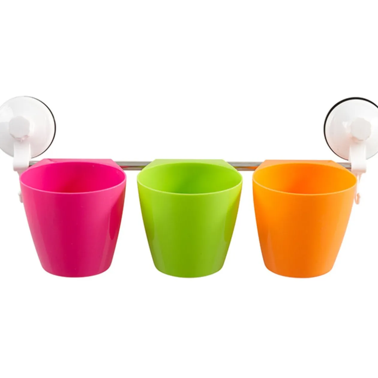 Barre à suspendre en inox L. 44 cm et 3 pots amovibles en plastique. Fixation par ventouse, pas besoin de faire de trous.