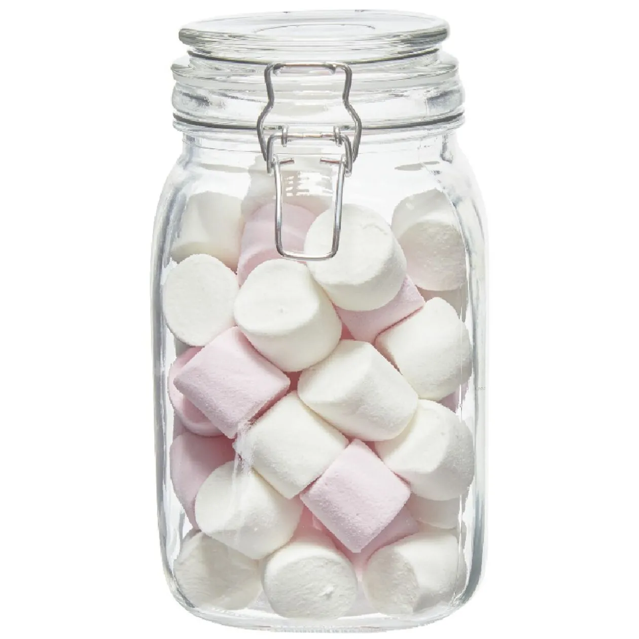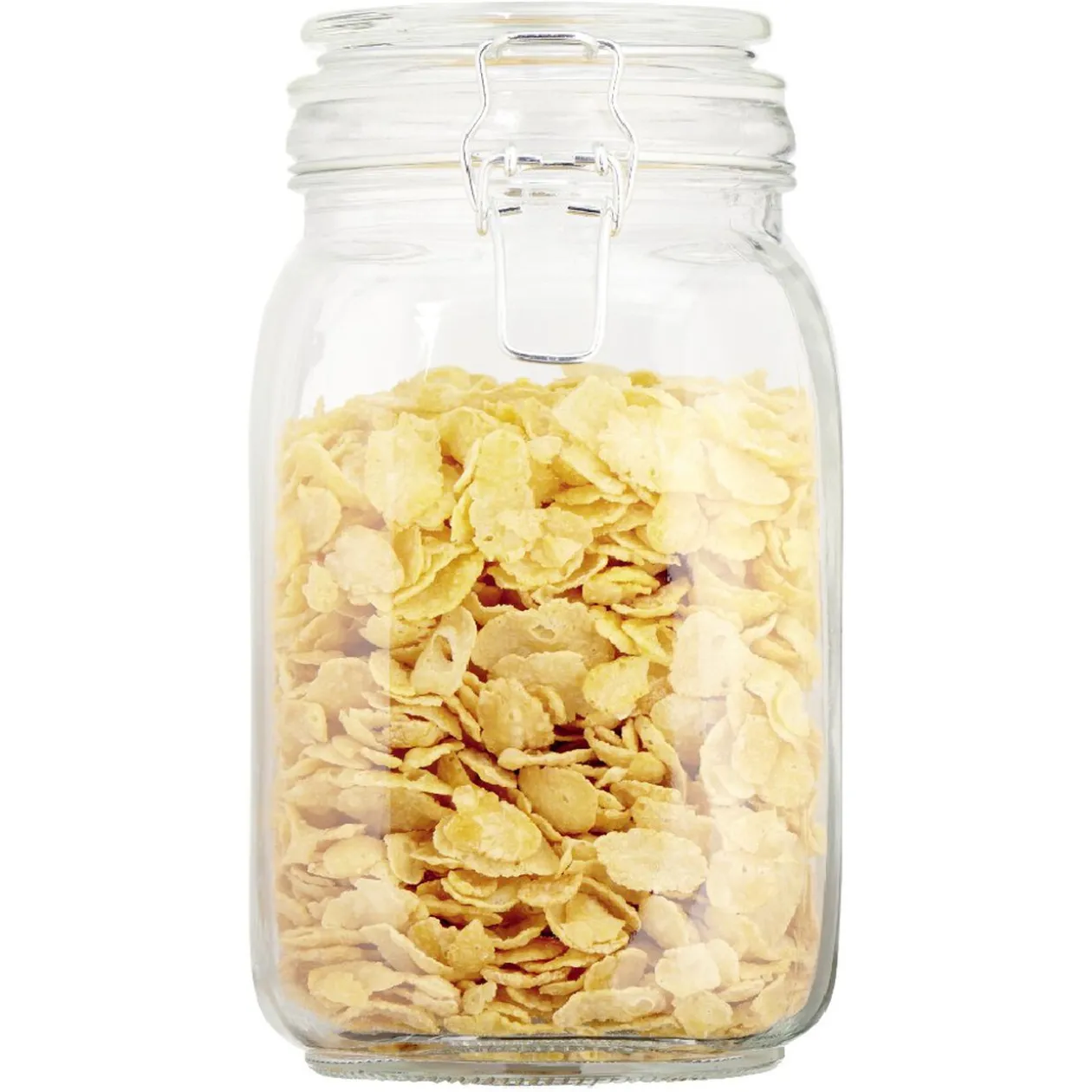 Bocal alimentaire transparent avec couvercle à fermeture métallique.