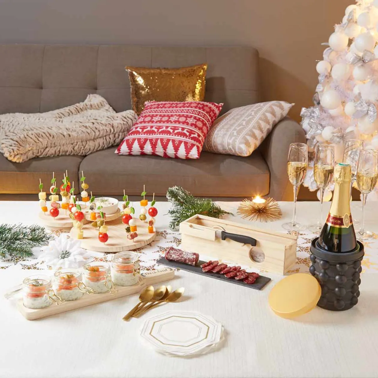 La planche de service idéale pour des entrées et des apéritifs réussis. Avec ces 4 bocaux de petites tailles à fermeture dorée, servez de façon pratique en les encastrant dans la jolie planche en bois. Avec des tranches de pain croustillant, remplissez un bocal de foie gras, un autre de chutney de figue, un de confit d’oignon et le dernier de mangues marinées. Ce service rustique vous fera gagner du temps et vous pourrez ranger vos bocaux au frigo s’ils ne sont pas vides. Idéal pour Noël, orné de sa couleur dorée, la bonne franquette n’a jamais été aussi décorative.