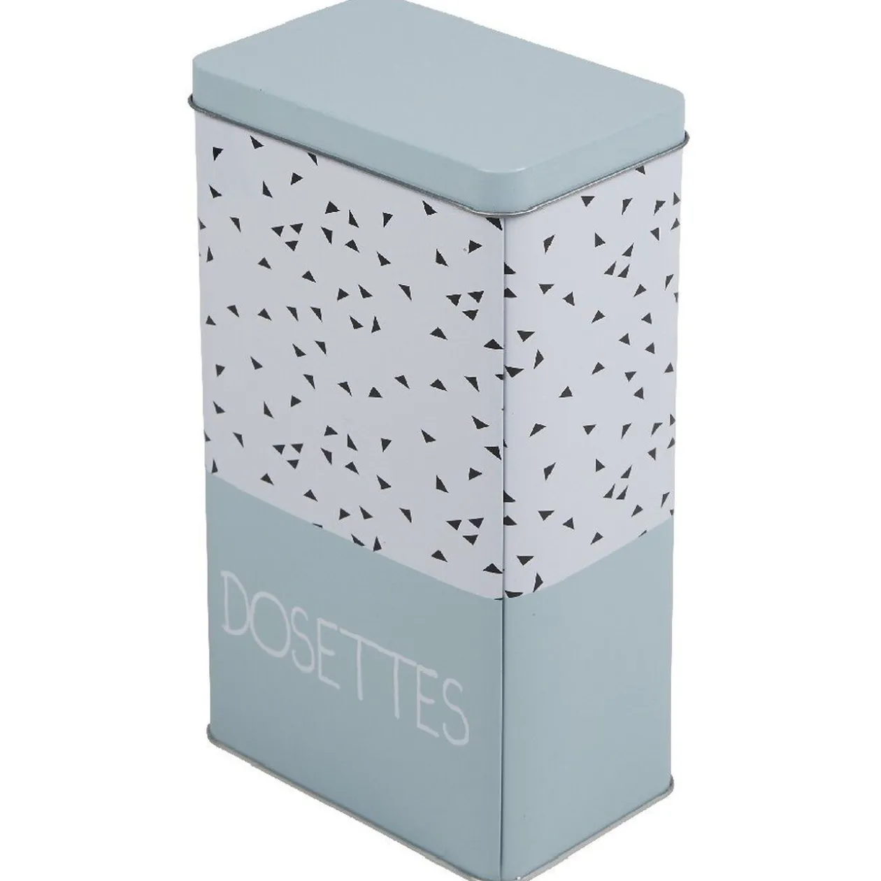Boîte à café rectangulaire de couleur vert d’eau et blanc motifs triangles noirs.