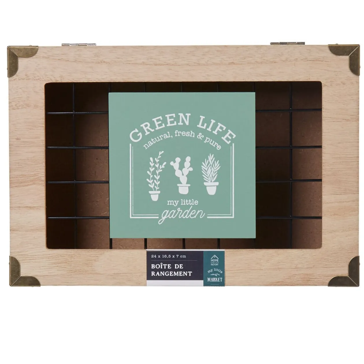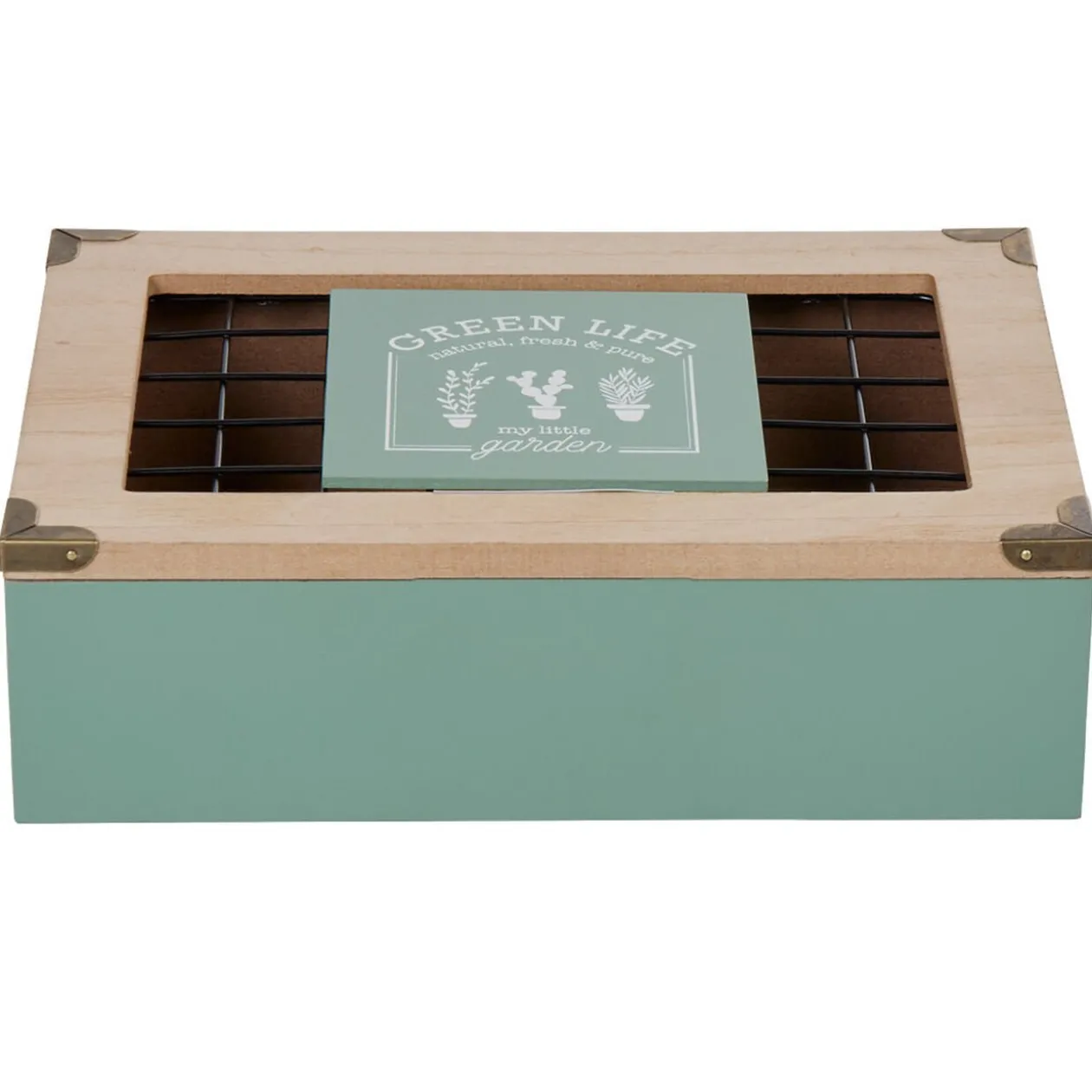 Boîte à thé en bois de couleur verte, avec couvercle en aluminium et motif « My little garden ».