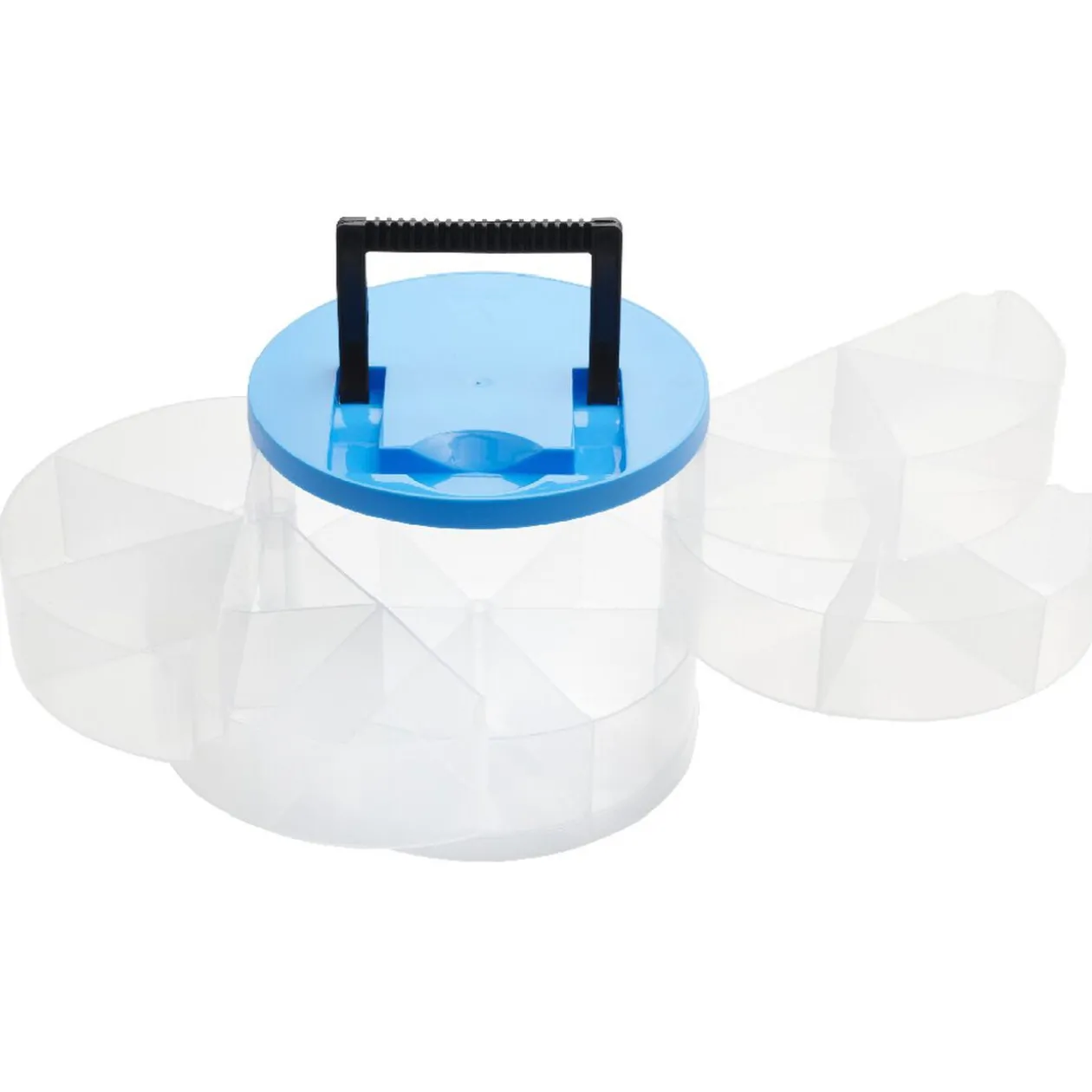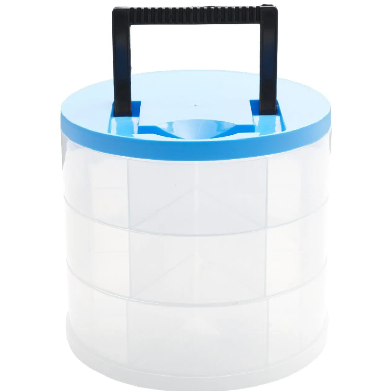 Boîte de rangement transparente avec couvercle coloré.