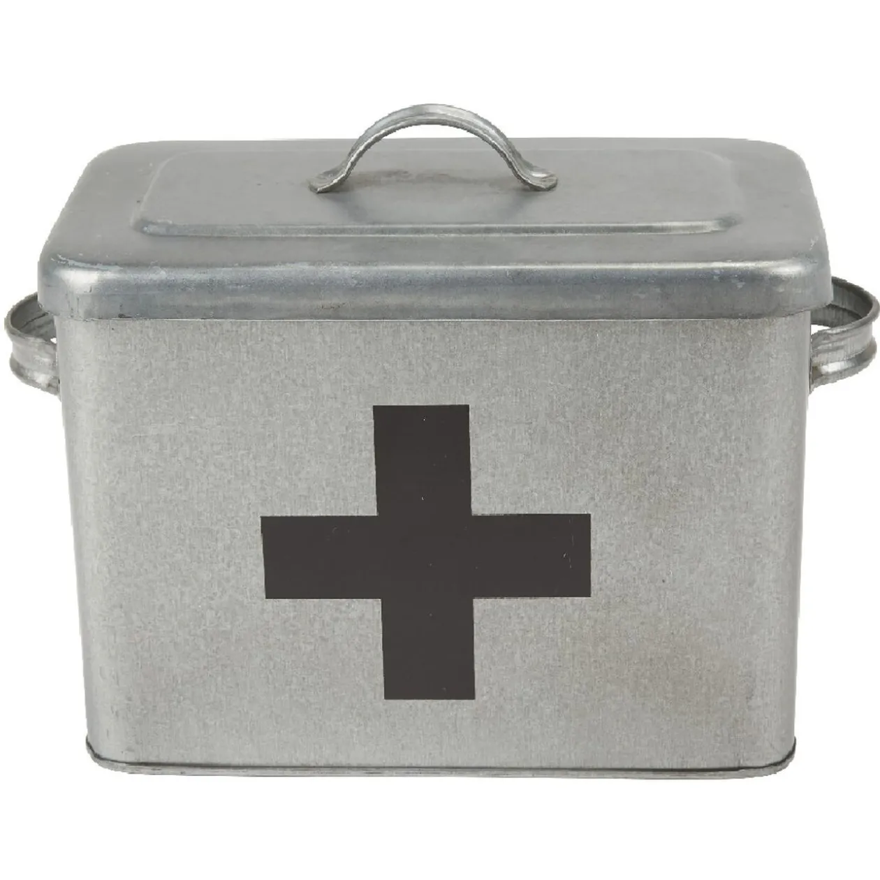 Boîte à pharmacie en fer dotée d’un couvercle et d’un panier amovible compartimenté pour organiser tout votre nécessaire de soins.