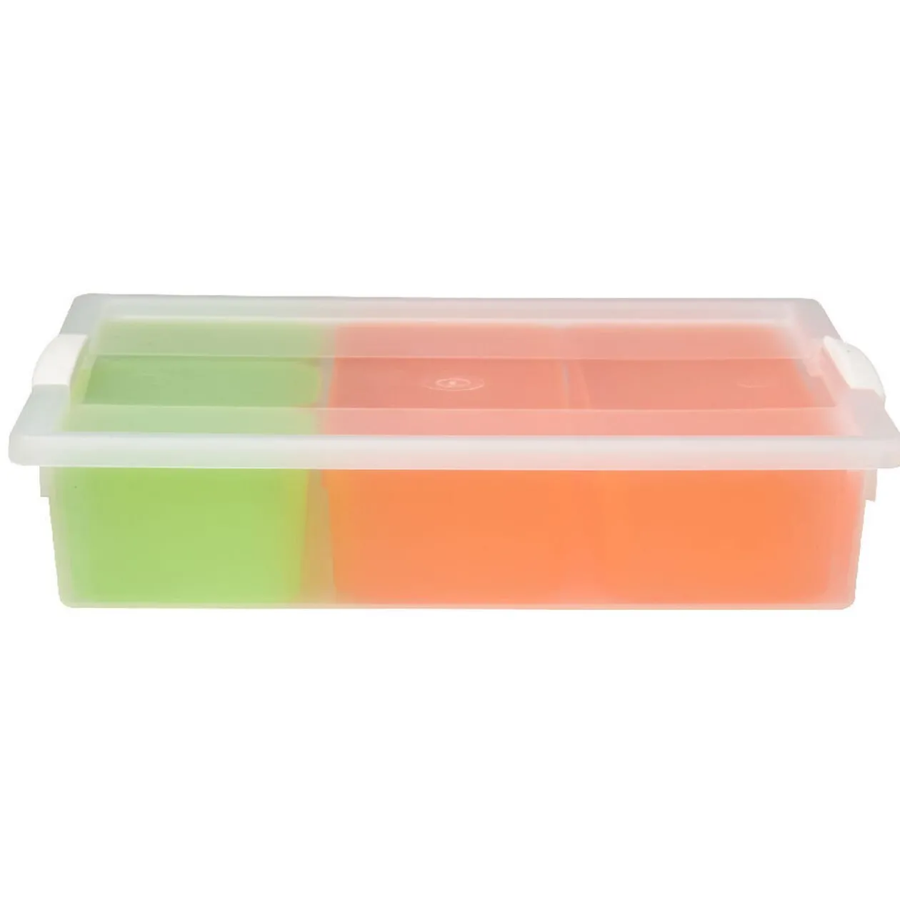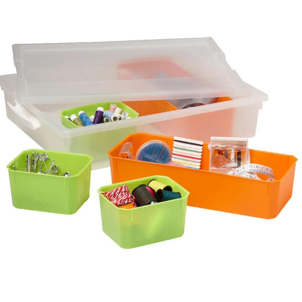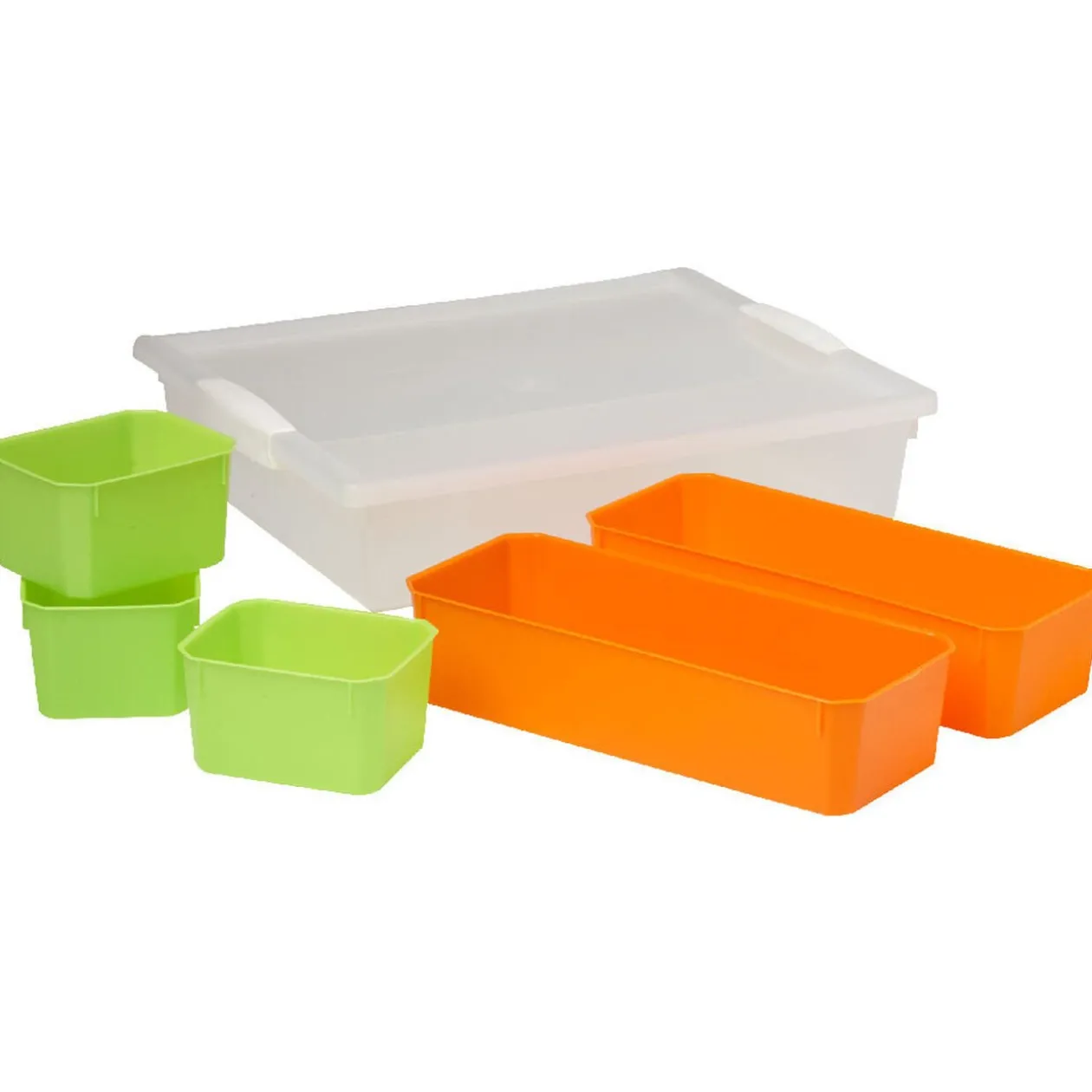 Boîte de rangement transparente contenant 5 casiers amovibles oranges et verts, fermeture clips.