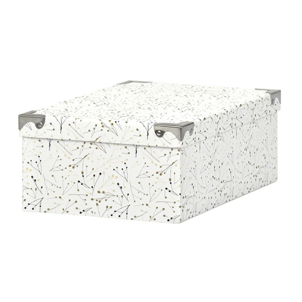 Boîte de rangement en carton avec coins renforcés en métal.
