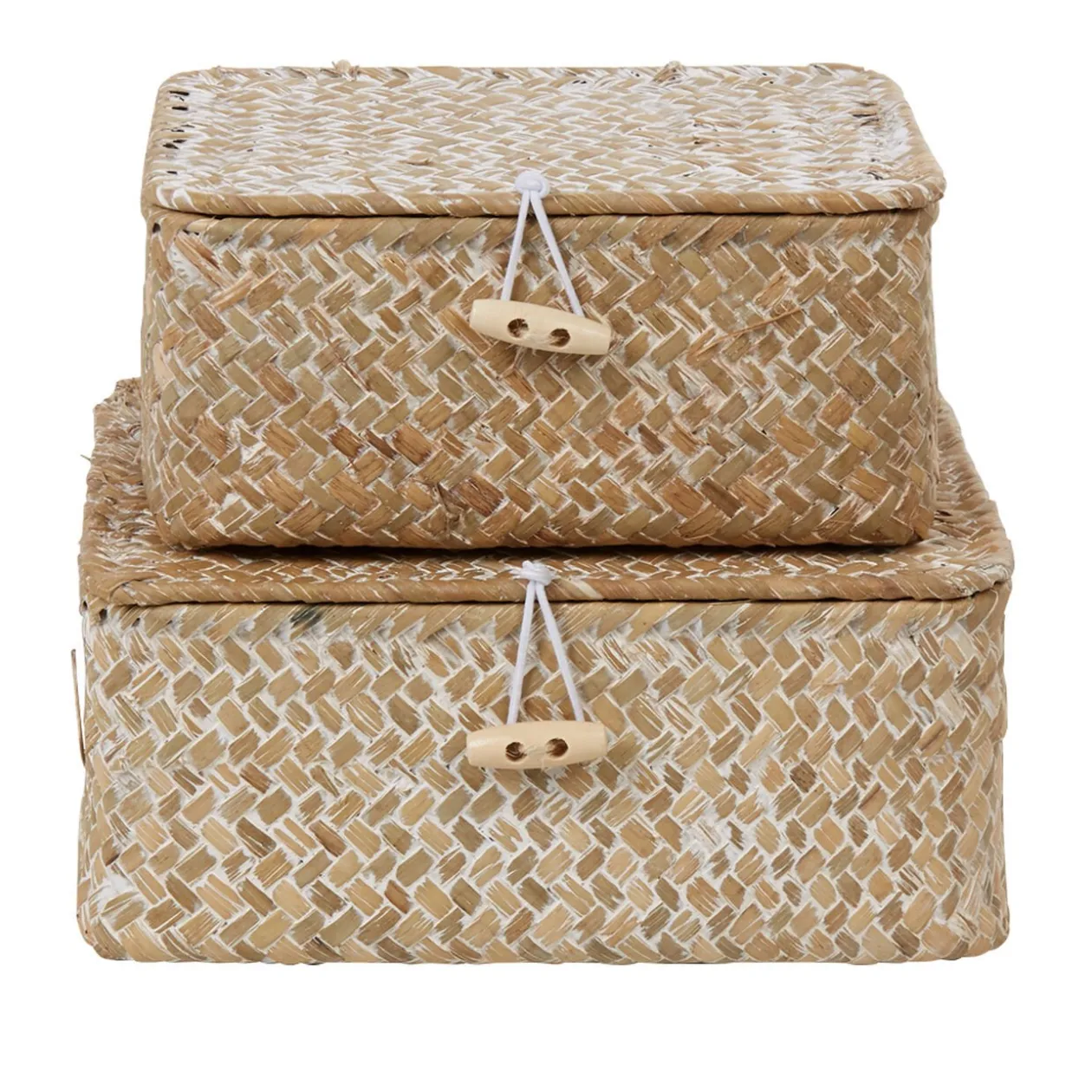 Ce set de deux boîtes avec couvercle en jonc de mer tressé est parfait pour apporter un charme authentique et artisanal à votre intérieur.