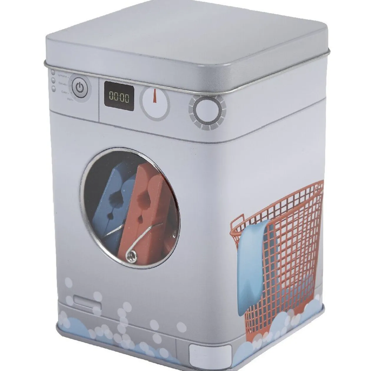 Boîte de rangement en métal pour pinces à linge en forme de machine à laver.