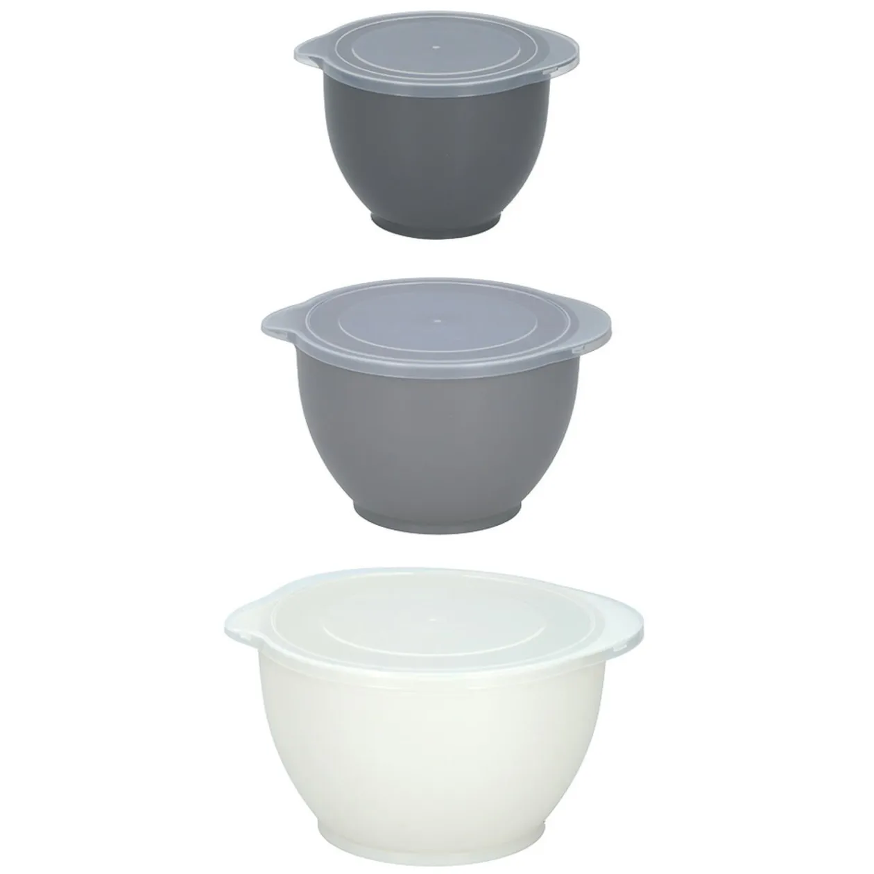 Lot de 3 bols en plastique gris et blanc avec couvercle transparent.
