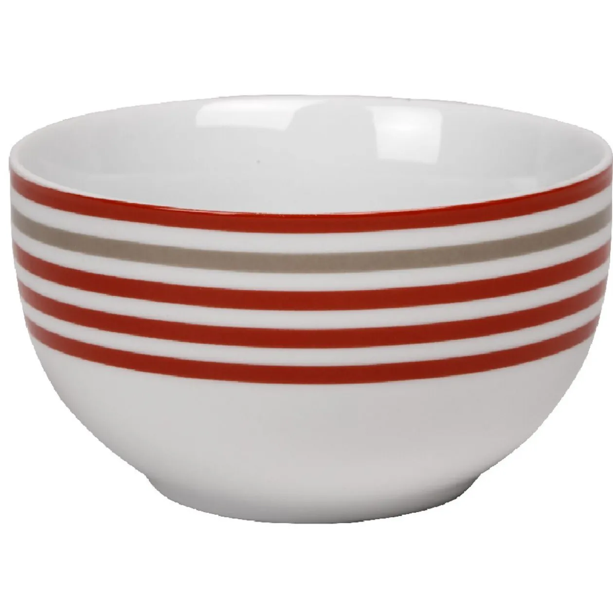 Bol blanc à rayures rouges et taupe, idéal pour vous servir les céréales du matin.