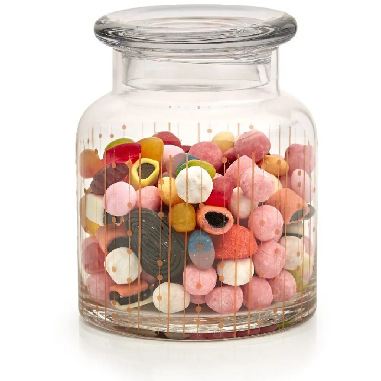 Bonbonnière transparente à motifs cuivrés, Ø 13×16 cm, verre.