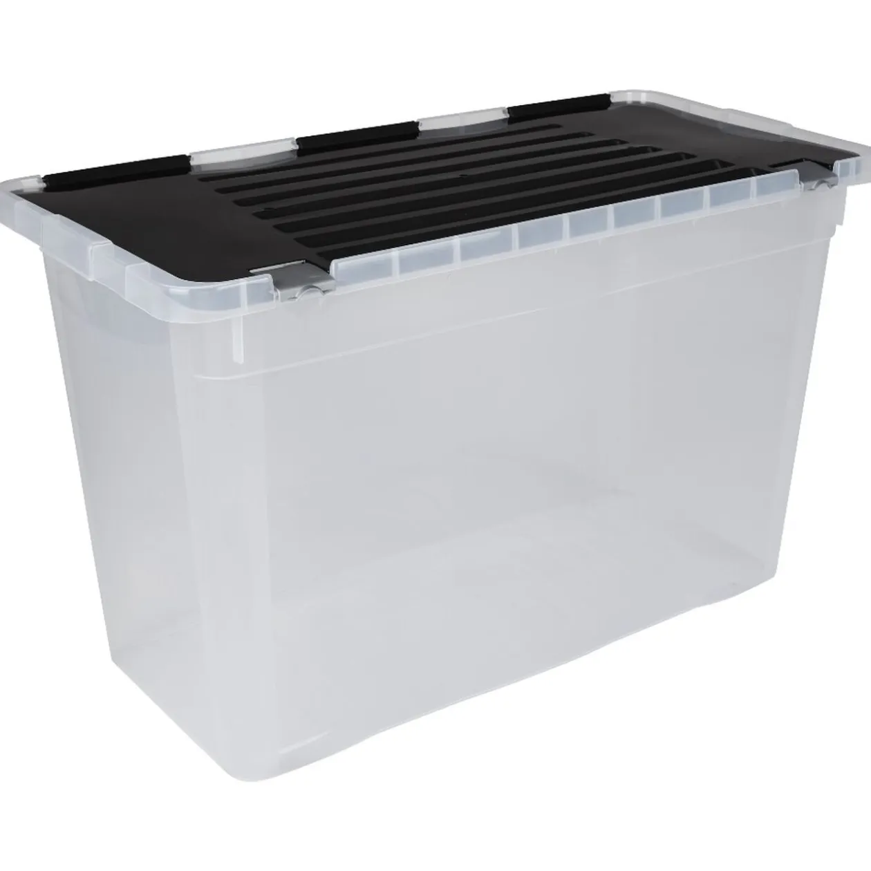 Boîte de rangement en plastique transparente avec couvercle noir. Pratique, pour vérifier en un coup d’oeil le contenu! Ce grand box d’une capacité de 100 litres avec fermeture à rabat dotée de clips vous permettra d’entreposer et stocker du linge ou matériel divers dans le bureau, le garage ou la buanderie.