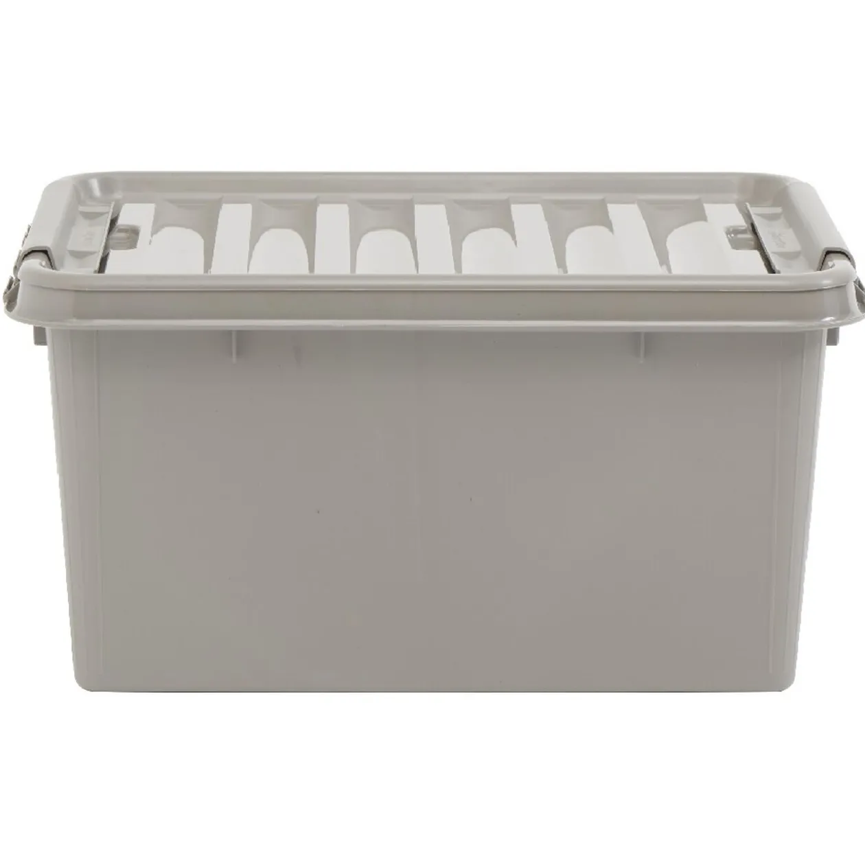Box de rangement grise avec couvercle, d’une contenance de 31 litres. Idéale pour optimiser le rangement de votre salon, ou même votre bureau ! Adaptez cette box selon vos besoins de rangement.