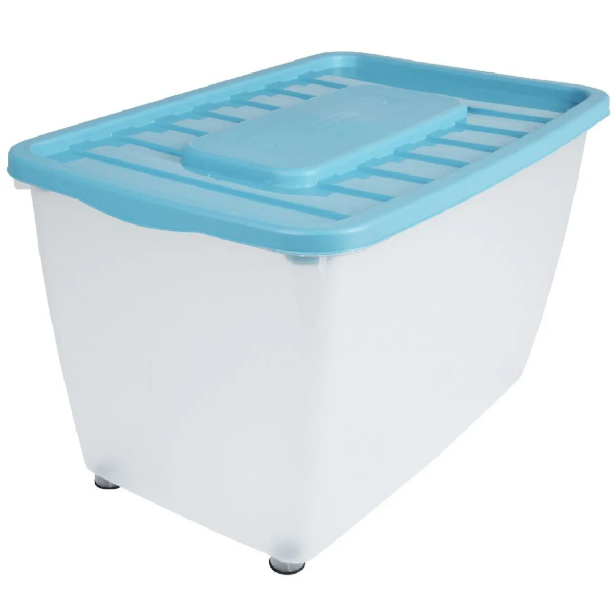 Lot de 3 box de rangement transparent avec couvercle de couleur (rose, bleu et noir).